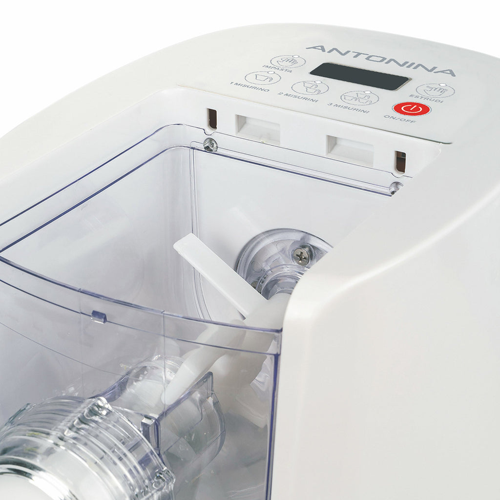 Antonina è la nuova macchina della pasta KooperX automatica e intelligente, e da oggi è anche il nome che darai alla felicità, quella che si prova di fronte al gusto buono e autentico delle cose. Display digitale, dosaggio facilitato degli ingredienti, 13 trafile per gustare, proprio a casa tua, tutti i formati di pasta più amati. Paura di sporcare la cucina? Niente paura! L'impasto si prepara da sé all'interno del contenitore: metti insieme farina e liquidi seguendo le indicazioni sul manuale, scegli il tuo formato preferito e attendi la trafilatura. La pasta è pronta per essere cotta e condivisa come tradizione vuole. Sperimenta con gli ingredienti, testa farine diverse, colora la pasta con il succo di verdura. Quale? Il tuo preferito!
