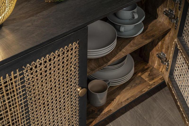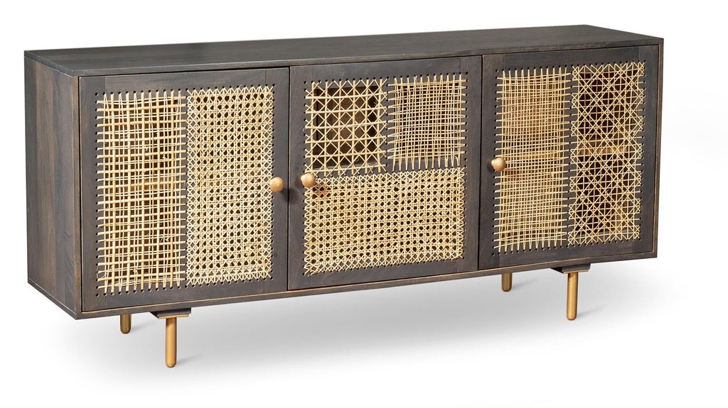 Madia 3 Ante 160x38x75 cm in Legno di Mango Grigio Scuro e Rattan