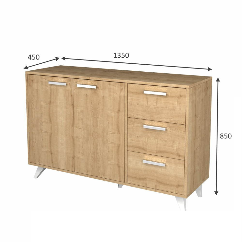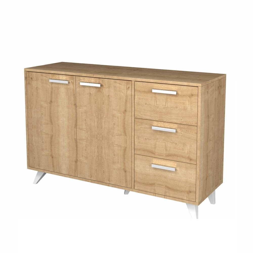 Madia capiente e funzionale. Il colore rovere la rende facilmente abbinabile ad ogni ambiente. Dotata di 2 ante e 3 cassetti. Grazie alla sua semplicità la puoi posizionare in soggiorno, ingresso, ufficio e ovunque tu voglia. Maniglie silver e piedini bianchi.