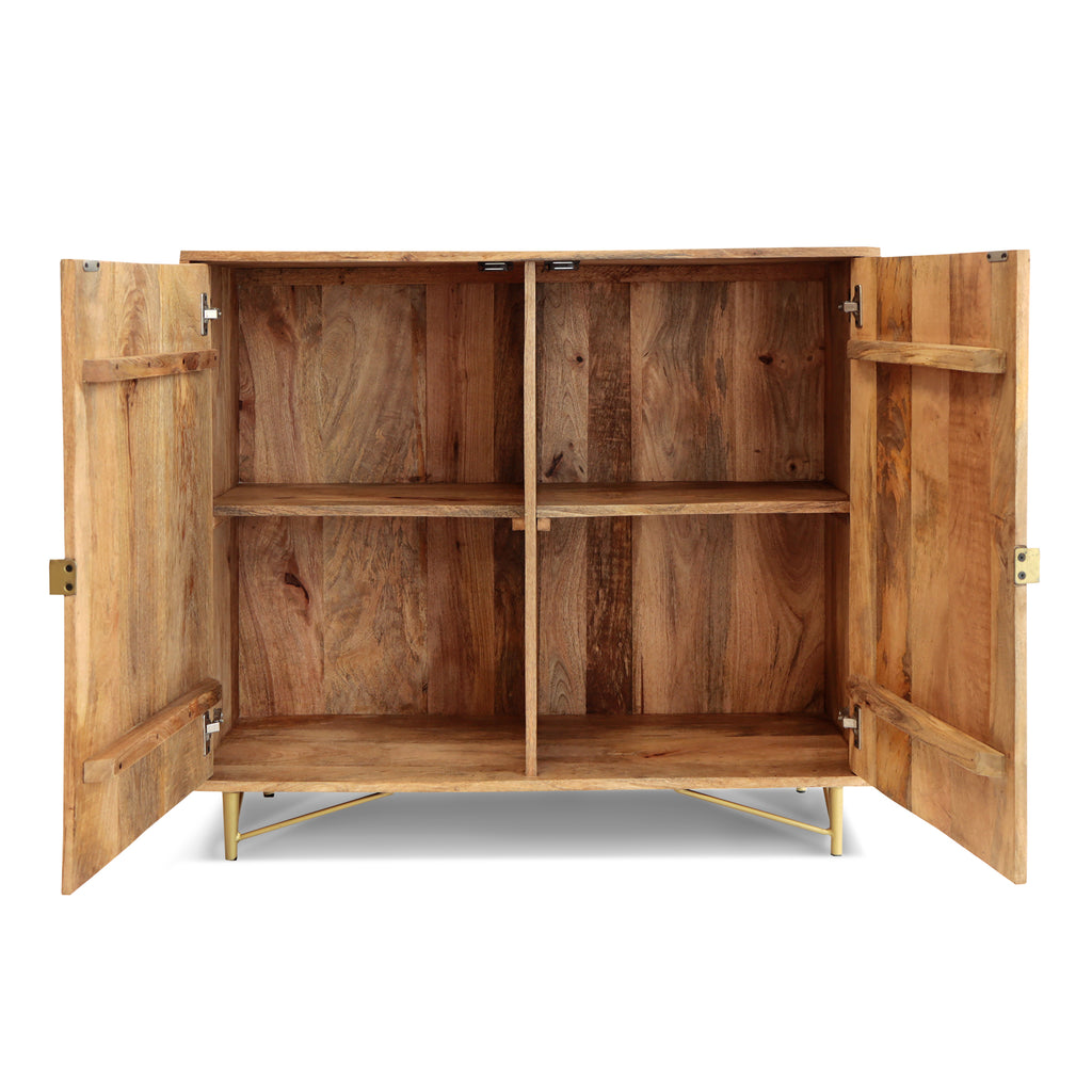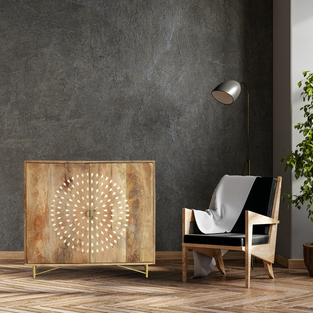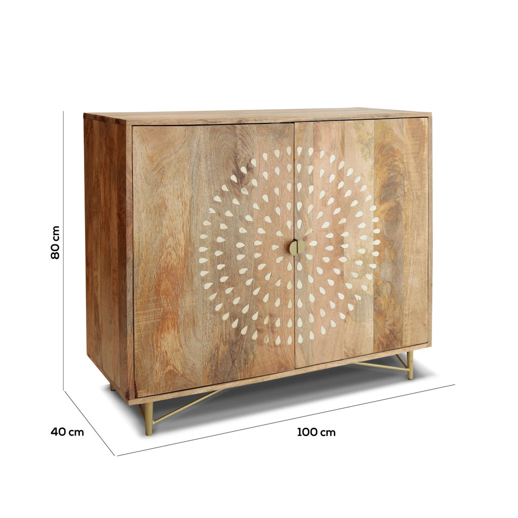 Design minimal e lineare, la madia Ines è però caratterizzata dall'elegante decoro circolare che parte dal centro di estende verso i lati, piccoli petali di color bianco si espandono dal centro, occupato dal particolare pomello in oro effetto satinato, verso l'esterno decorando gran parte delle due ante. L'oro effetto satinato, del pomello e delle gambe, crea una perfetta sintonia con il colore del legno di mango.