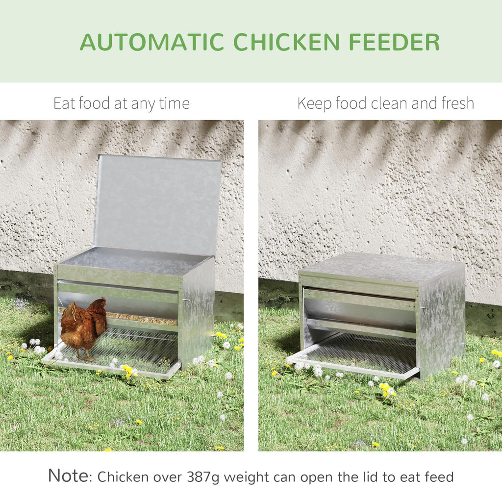 La mangiatoia per polli di ha una capacità da 22 litri e può consentire a 4 polli di mangiare insieme in qualsiasi momento. La nostra mangiatoia per pollame è realizzata in lamiera zincata resistente e durevole, e fornisce una protezione dall'acqua per garantire l'essiccazione del mangime. Il design completo di questa mangiatoia per polli all'aperto li farà crescere in modo sano.
