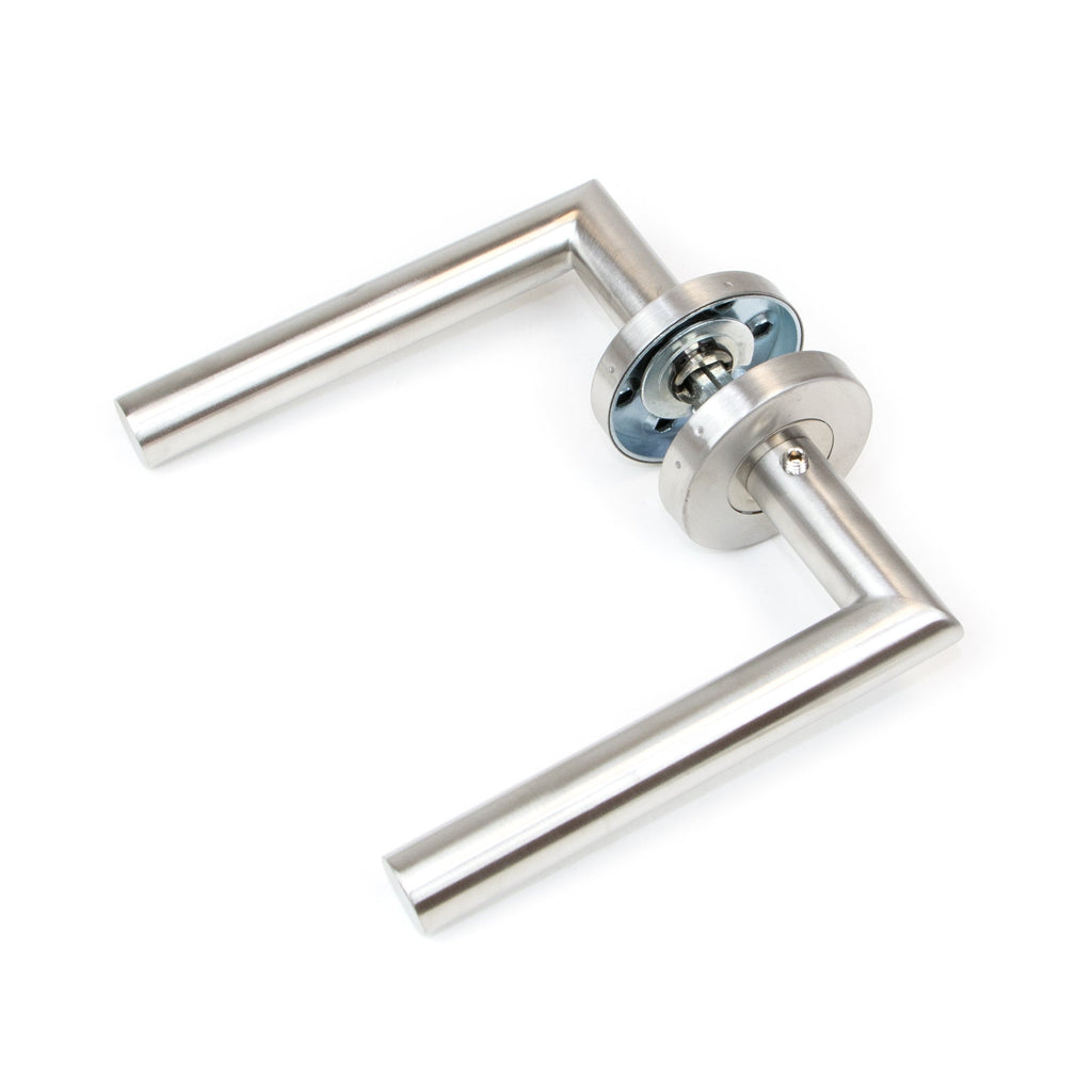 Coppia di maniglie a forma L dritta per porta da interno con rosetta rotonda di diametro 53mm. Sono adatte per porte di spessore tra 35mm e 45mm e hanno una molla di ritorno per rimettere la maniglia alla sua posizione orizontale.