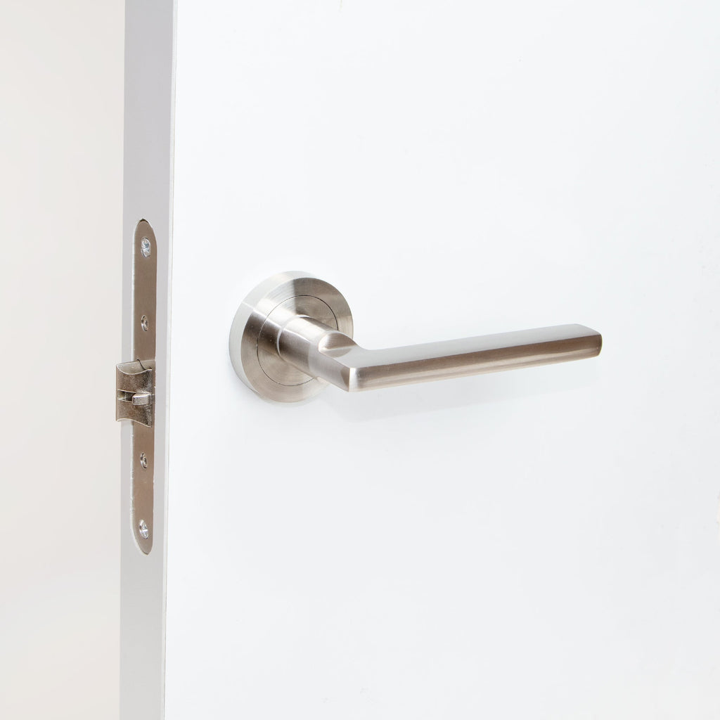 Coppia di maniglie per porta da interno. Sono disponibili nei modelli con rosetta rotonda di diametro 50mm, rosetta quadrata 50x50mm e con placca. Sono adatte per porte di spessore tra 35mm e 45mm e hanno una molla di ritorno per rimettere la maniglia alla sua posizione orizontale.