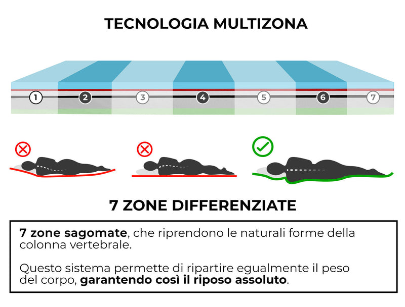 Supreme è un materasso caratterizzato da 7 zone sagomate, che riprendono le naturali forme della colonna vertebrale. Questo sistema permette di ripartire egualmente il peso del corpo, garantendo così il riposo assoluto. Il Memory, grazie alla schiuma poliuterana ed alla particolare densità, garantisce elasticità ed indeformità, un adeguato riposo e la prevenzione di dolori muscolari al risveglio. Se quando ti svegli non ti senti riposato, hai dolore alla schiena o avverti una cospicua rigidità muscolare, sicuramente non hai scelto un buon materasso.