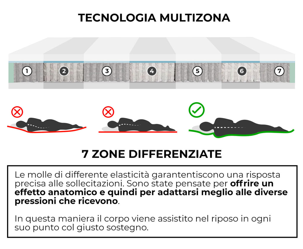 Deluxe è un materasso a molle insacchettate indipendenti racchiuse ognuna in un sacchetto di cotone che agiscono indipendentemente l'una dall'altra confortando delicatamente il tuo corpo, adeguandosi silenziosamente ad ogni movimento del corpo, agendo indipendentemente ad ogni pressione ricevuta senza sollecitare le altre. Le 800 molle (nella versione matrimoniale) sono realizzate in filo di acciaio temperato e sono di diverso spessore, disposte in 7 zone differenziate, garantendo una risposta precisa alle sollecitazioni. Sono state pensate per offrire un effetto anatomico e quindi per adattarsi meglio alle diverse pressioni che ricevono. in questa maniera il corpo viene assistito nel riposo in ogni suo punto col giusto sostegno.