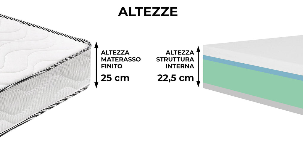 - Altezza materasso finito (con rivestimento): 25 cm circa