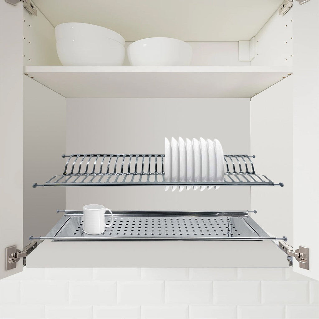 Scolapiatti ad incasso di 76cm con attacco a molle e vaschetta raccogli gocce in acciaio inox. La sua lunghezza varia da 73 cm a 78 cm grazie alle sue molle. È costituito da una griglia superiore per posizionare piatti piani e fondi, una base per i bicchieri e vaschetta come gocciolatoio. Facile e Veloce da installare da installare e bello da vedere. Riduzione del 90% delle flessioni a pieno carico del portapiatti ed eccezionale stabilità dei piatti.