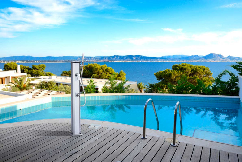 Mini Doccia a Riscaldamento Solare da Giardino e Piscina 20 litri con Miscelatore Caldo-Freddo Lavapiedi e Doccetta. Questa doccia solare unisce design elegante e ingombro ridotto. Consegnata con la sua doccetta rimovibile, il suo utilizzo è semplice e giocoso.
