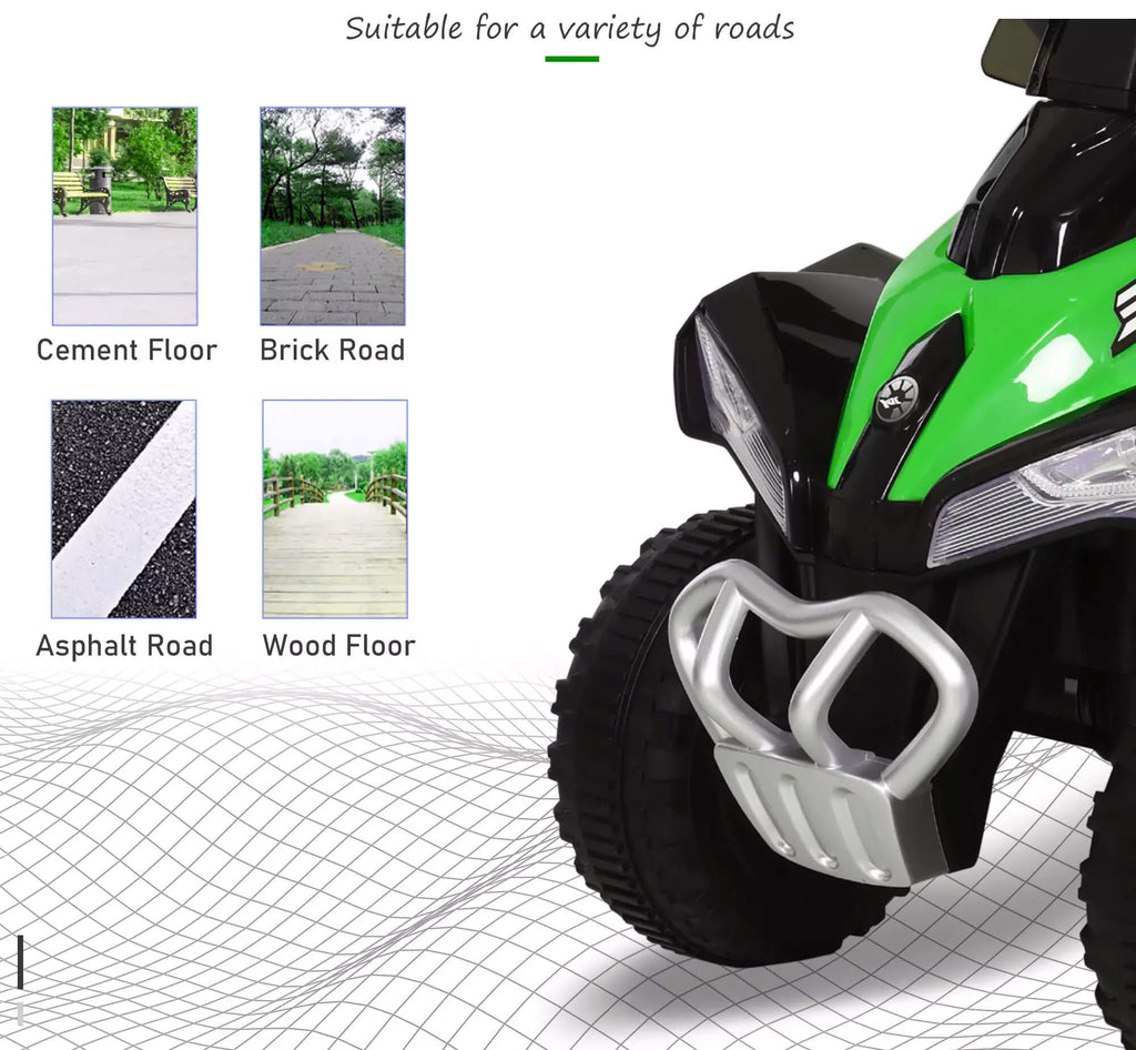 Divertiti insieme ai tuoi bambini con questo quad elettrico! Ha una guida realistica e sicura, ed è dotato di diverse funzioni come fanali posteriori e musica. Ha 4 ruote, per garantirti la massima stabilità, e può sostenere fino a 20kg di peso. La velocità è impostata su 3-5km/h per rendere la guida sicura e divertente.