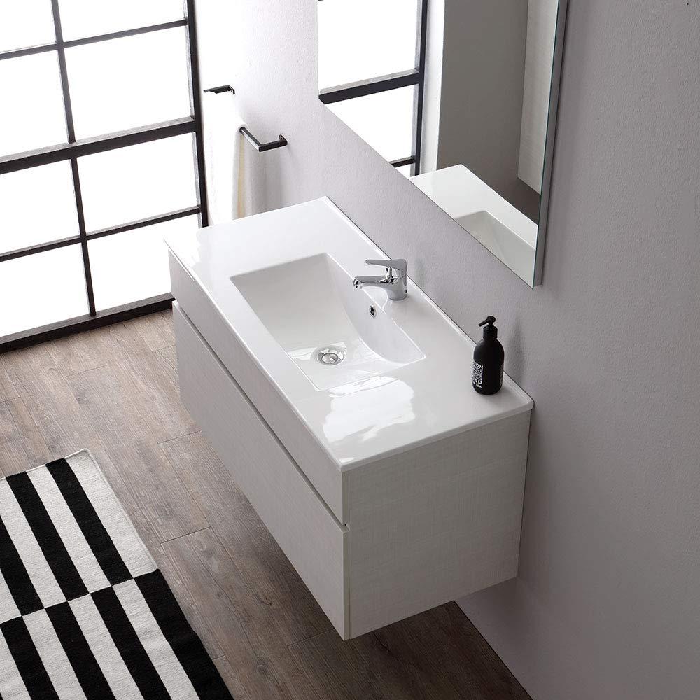 Un mobile da bagno con cassettone, top lavabo integrato in ceramica , specchio e luce LED in dotazione.