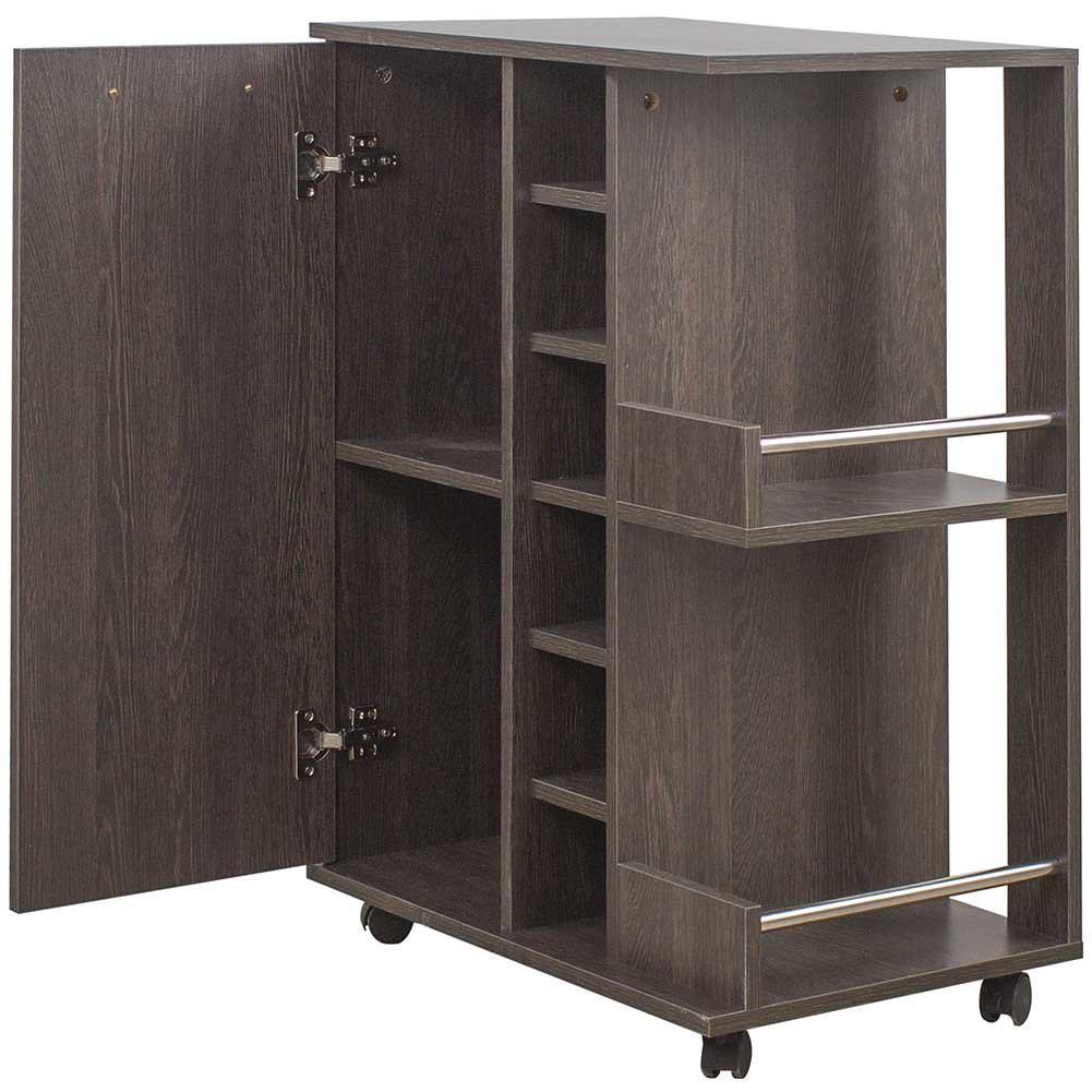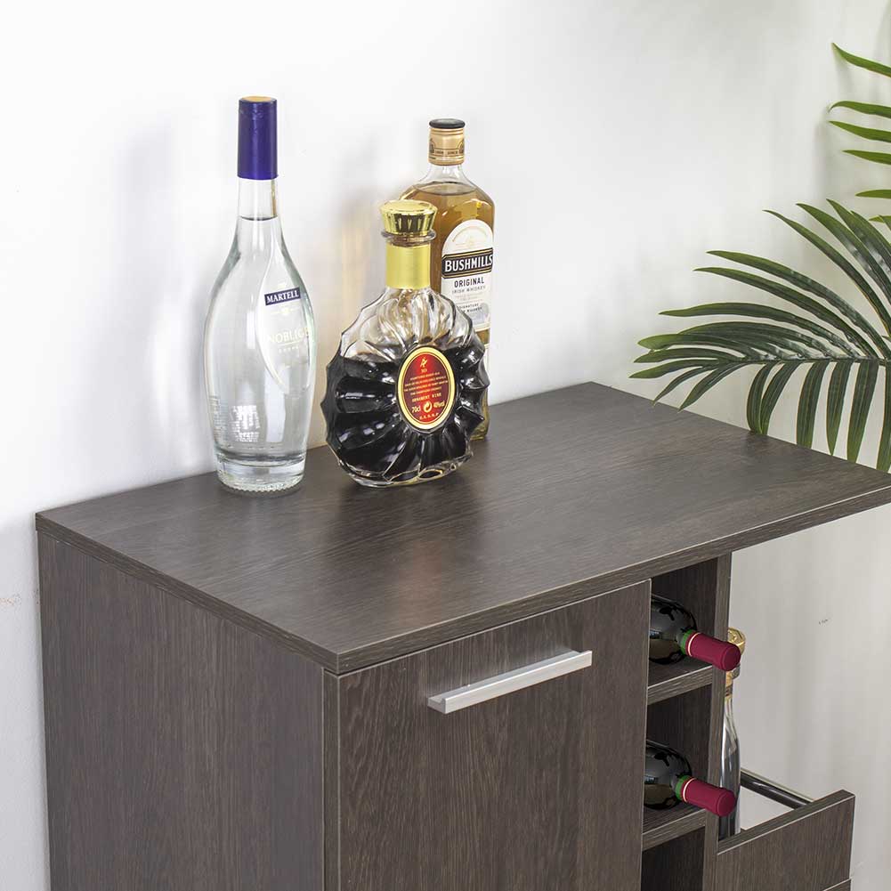 Il corpo sottostante al piano può essere suddiviso in 3 lati uno fornito di 6 ripiani portabottiglie dove è possibile inserire fino a circa 6 bottiglie di vino, l'altro con una fantastica porta dotata di maniglia in metallo con all'interno 2 spaziosi ripiani, oltre ad altri 2ripiani provvisti di barra laterale, dove è possibile conservare calici per il vino di varie dimensioni e flute da champagne, in questo modo avrete sempre tutto il necessario a portata di mano per bere un buon calice di vino.