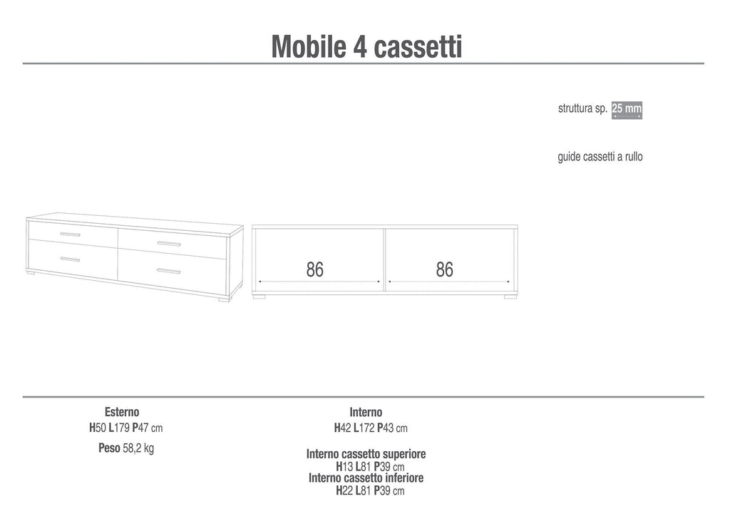 Mobile con 4 Cassetti 179x50x47 cm Ossido Bianco/Cemento