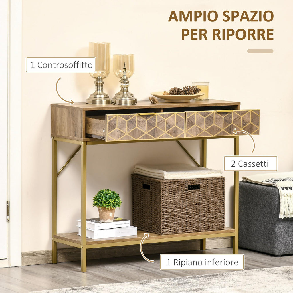 Aggiungere spazio e portare un tocco di glamour alla tua casa è un gioco da ragazzi con questo mobile consolle! Dotata di 2 cassetti spaziosi con una decorazione dorata originale, questa consolle per ingresso, camera e soggiorno ti permette di tenere in ordine i tuoi oggetti quotidiani. L'ampio piano d'appoggio e il ripiano inferiore offrono spazio per esporre soprammobili o piante. Sicura e stabile grazie al dispositivo antiribaltamento, questa consolle è ciò che manca alla tua casa!