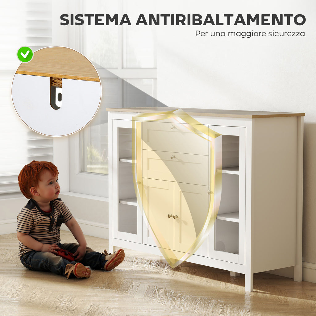 Mobile Cucina Credenza 120x40x90 cm con 2 Cassetti e 3 Armadietti Ante in Vetro Bianco e Rovere