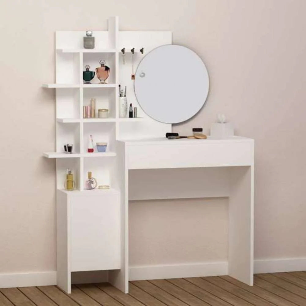 - Toilette trucco bianca con specchio rotondo, cassetto, anta con ripiano e vani a giorno