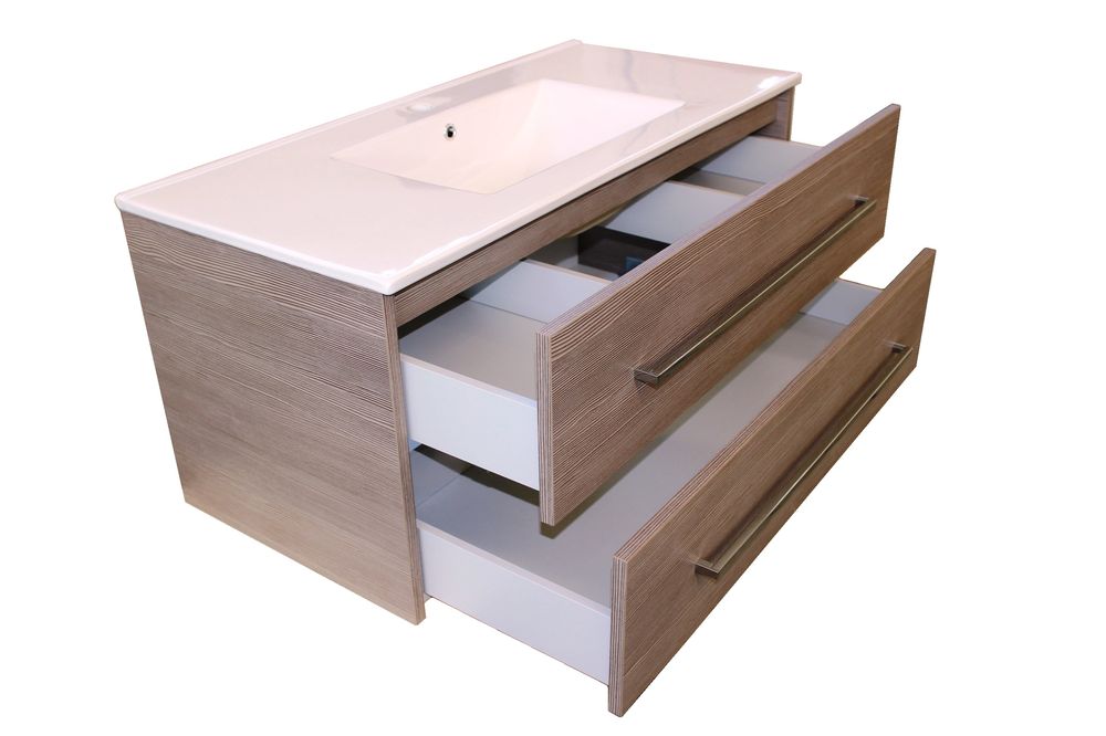 Arredo bagno composto da quattro pezzi, cassetti a chiusura morbida, lavandino di ceramica, specchio girevole, lampada a led e maniglie in metallo