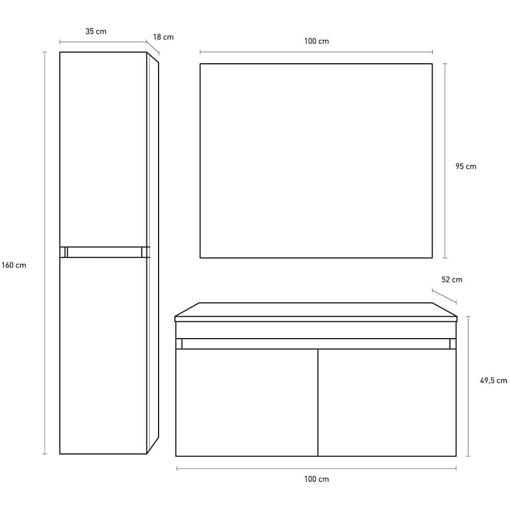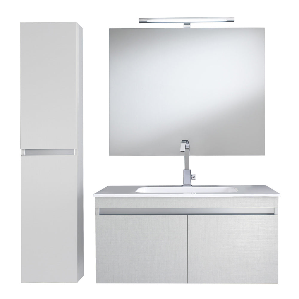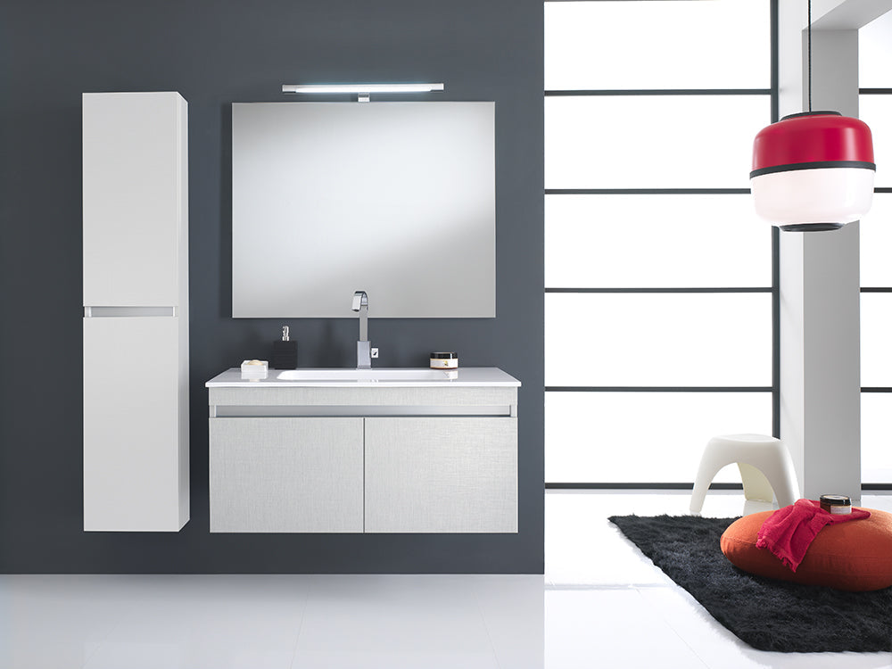 Arredo bagno moderno sospeso Bali 06 Maxi completo di colonna pensile, mobile sospeso con lavabo in stonelight e specchio con luce.