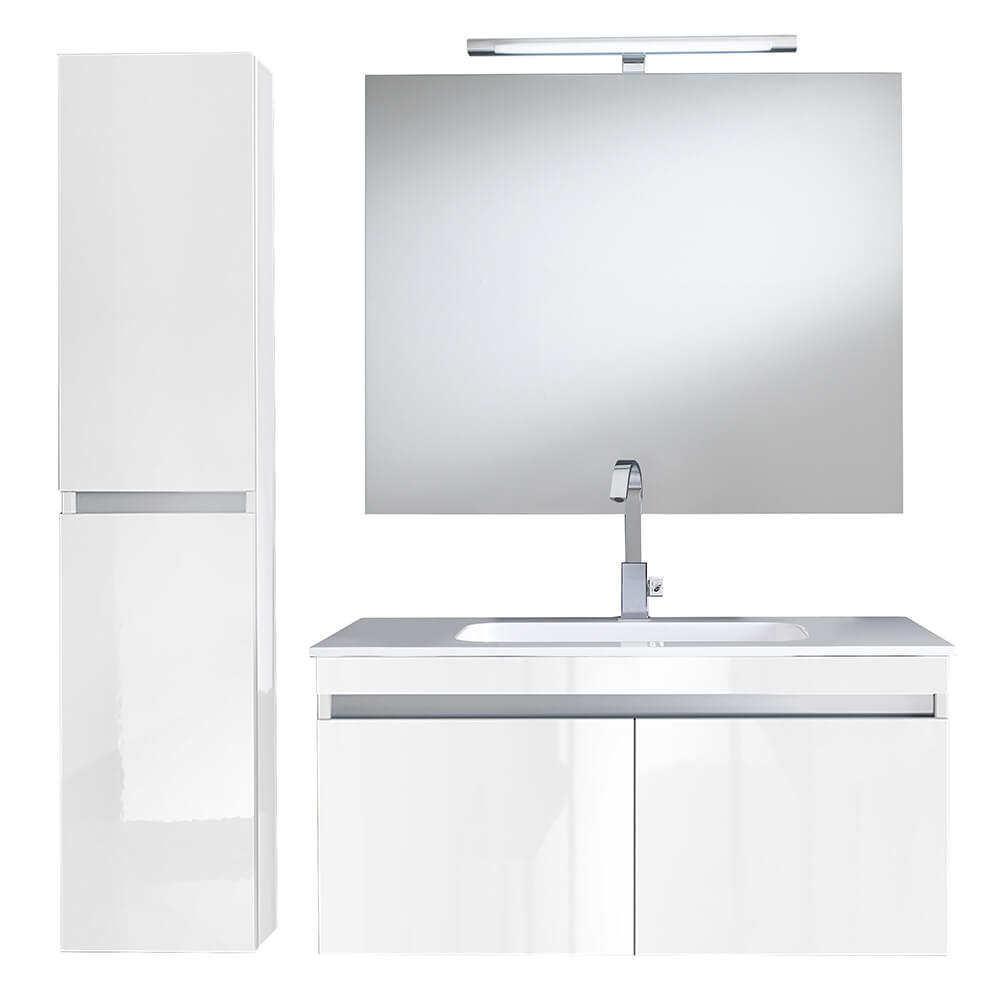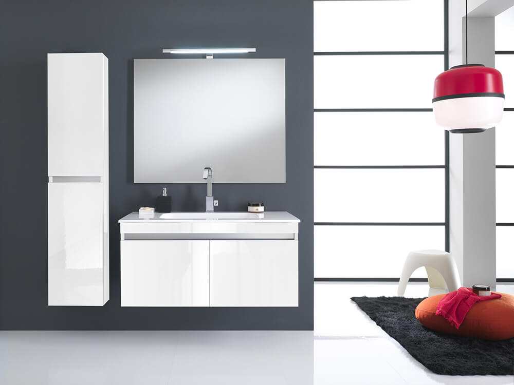 Arredo bagno moderno sospeso Bali 06 Maxi completo di colonna pensile, mobile sospeso con lavabo in stonelight e specchio con luce.