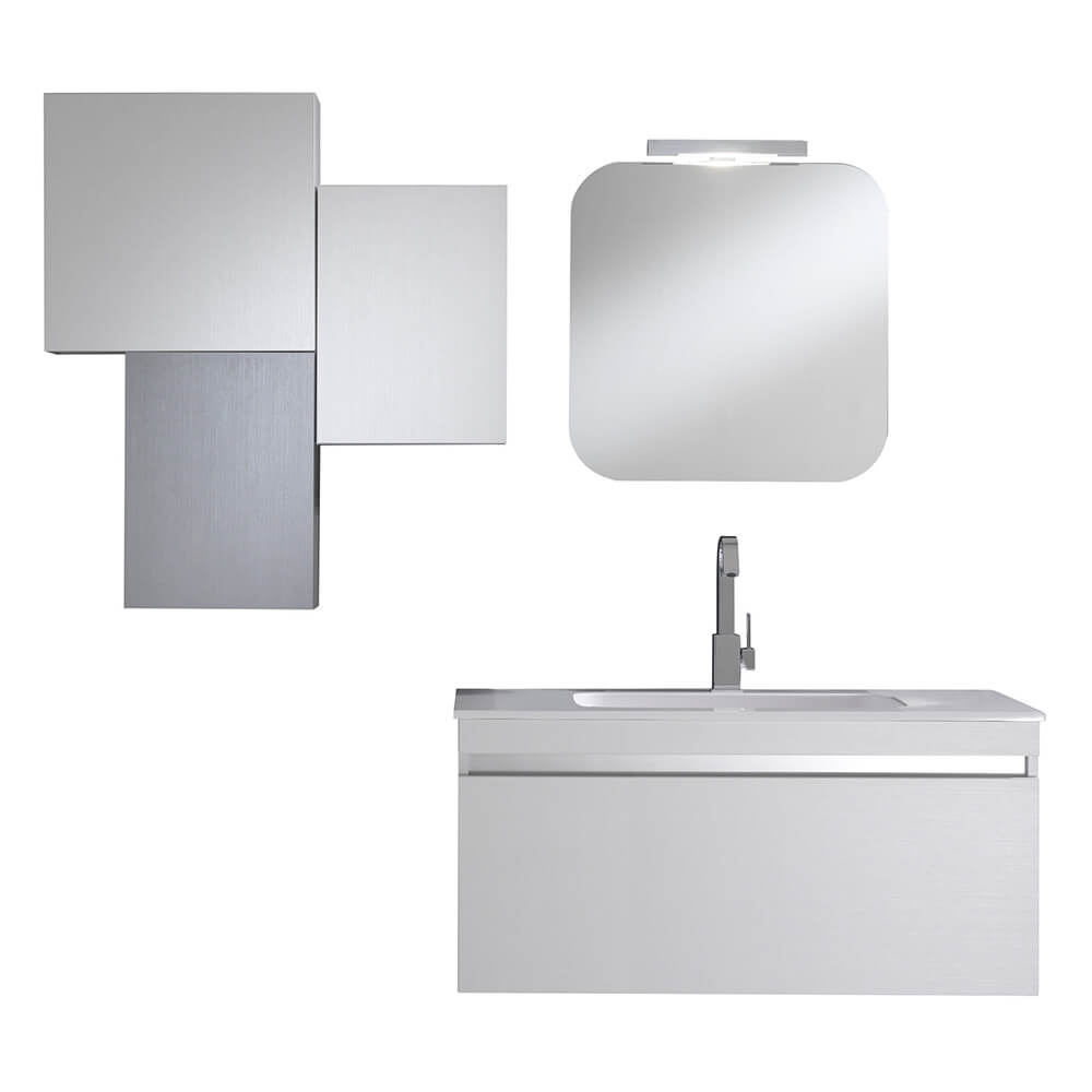 Arredo bagno moderno sospeso Bali Mix completo di 3 pensili, mobile mobile sospeso con lavabo in stonelight e specchio con luce.