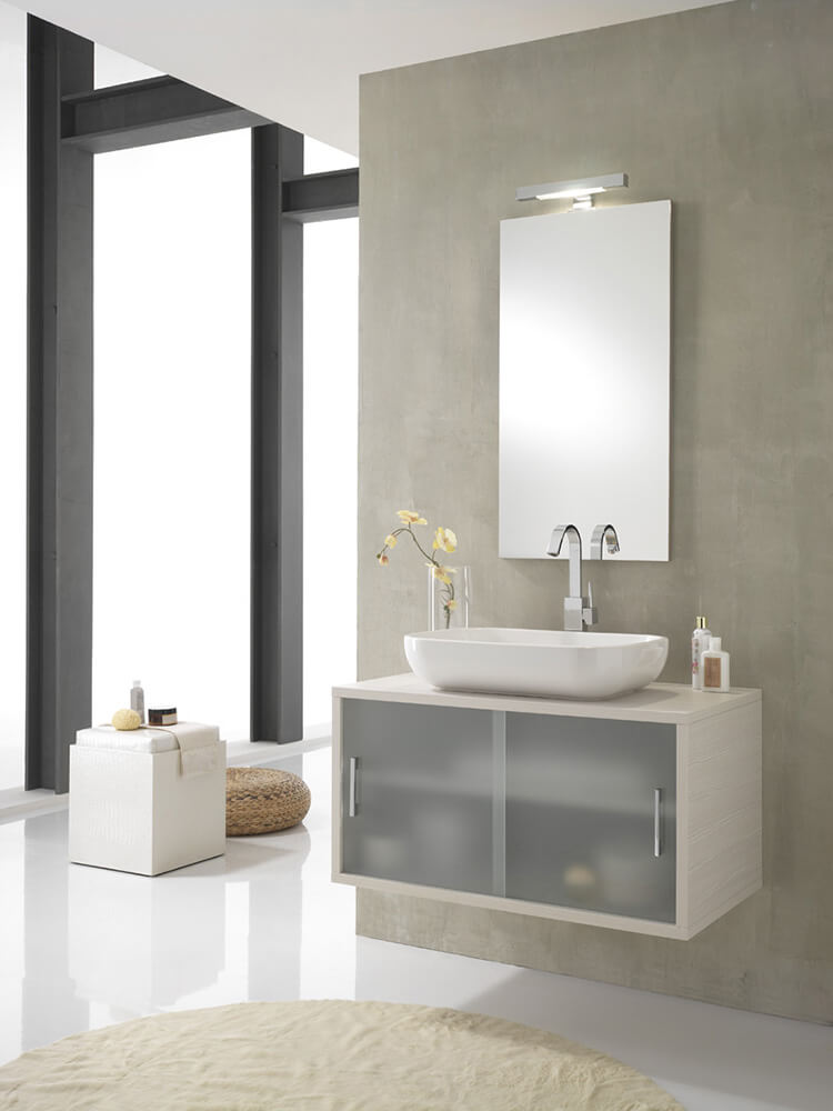 Arredo bagno moderno Giava 00 completo di base con ante scorrevoli e con lavabo in ceramica, specchio e lampada led.