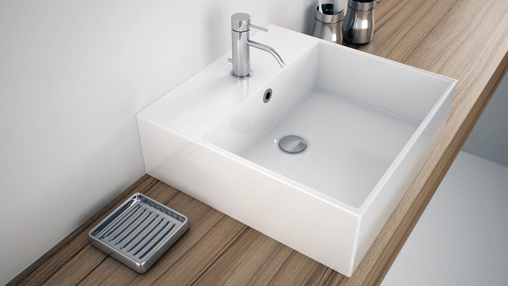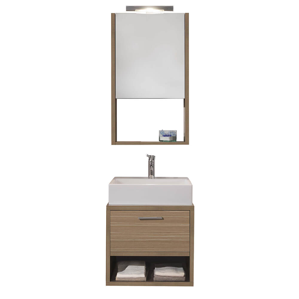 Arredo bagno moderno Giava 11 completo di base a una ribalta e con lavabo in ceramica, specchio a unanta e lampada led.