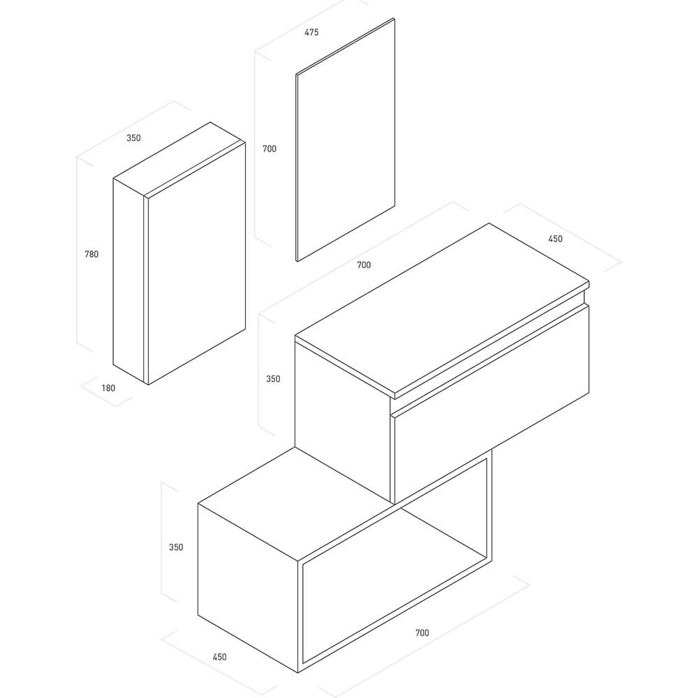 Arredo bagno moderno Ibiza 13 completo di base sospesa con cassetto soft close, base aperta, pensile alto reversibile, top con lavabo integrato in ceramica, specchiera e lampada led.
