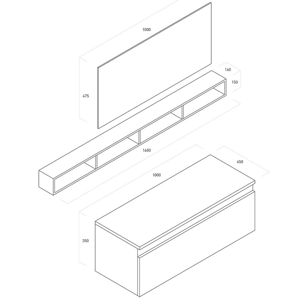 Arredo bagno moderno Ibiza 19 completo di base sospesa con cassetto soft close, elemento a giorno reversibile, cubo a giorno, top con lavabo integrato in ceramica, specchiera e lampada led.