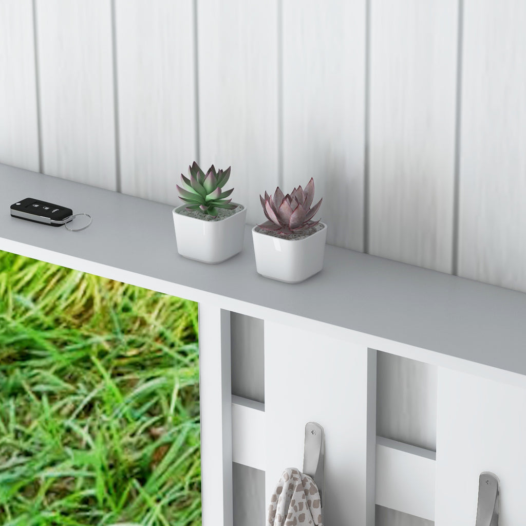 Rinnova l'ingresso di casa con il set di mobili. Un elegante set 4-in-1 che unisce uno specchio e un appendiabiti da muro con sei ganci e scaffale, più una panca scarpiera. La scarpiera moderna offre spazio per sistemare fino a 8 paia di scarpe e cuscini imbottiti per sedersi comodamente. La soluzione perfetta per ogni casa!
