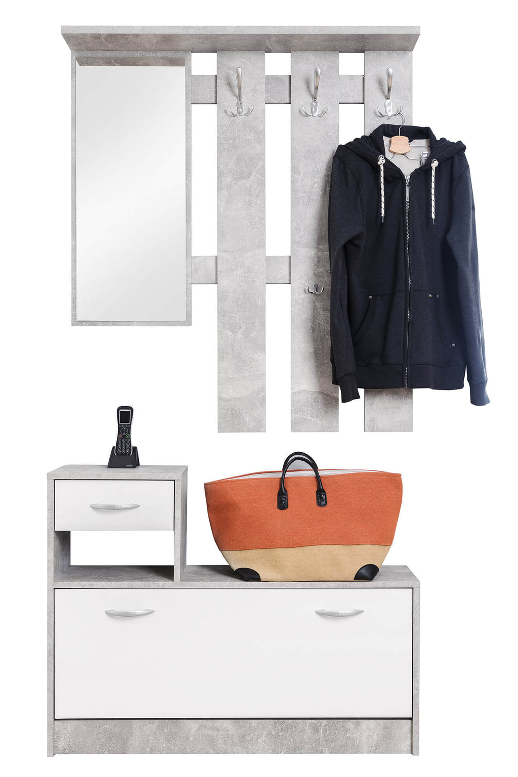 Mobile Ingresso Appendiabiti con Specchiera e Scarpiera in Truciolato Alfred Cemento e Bianco