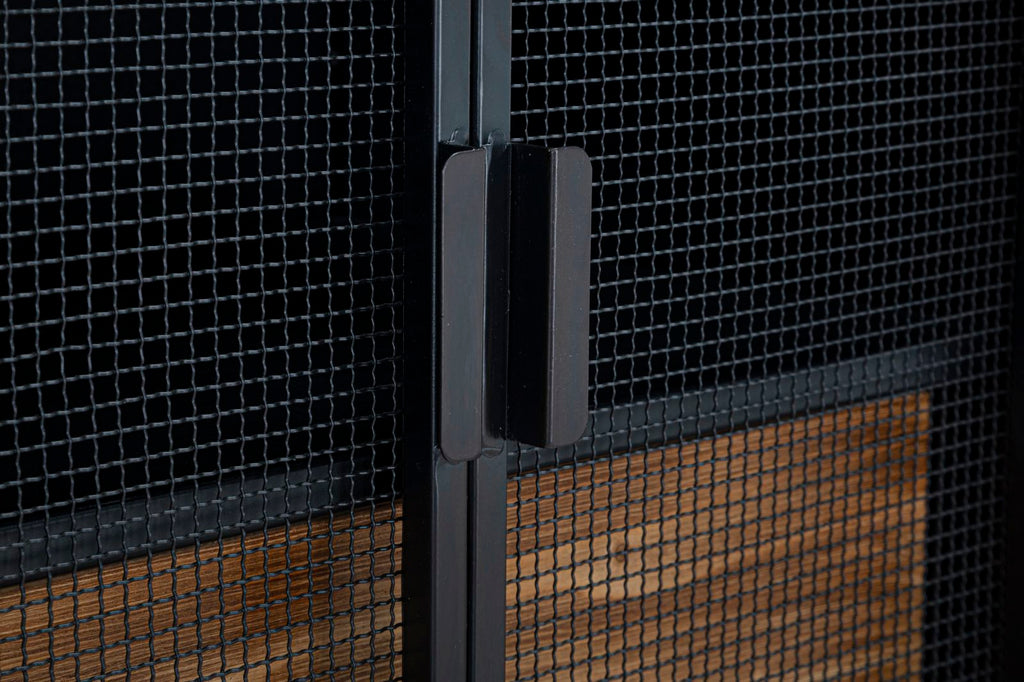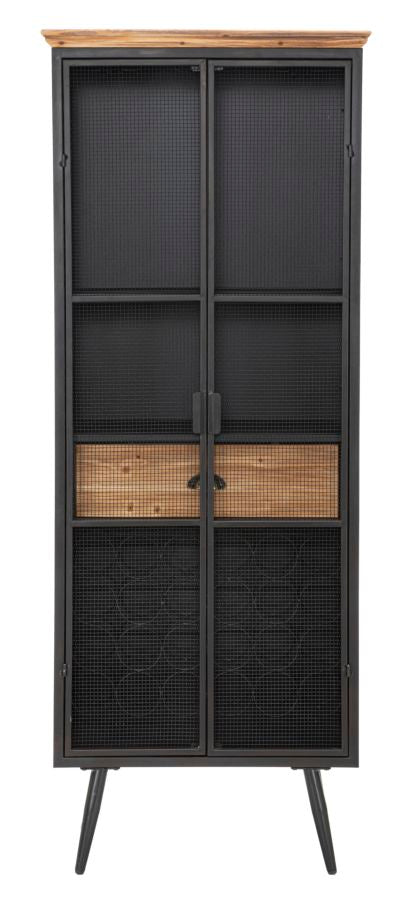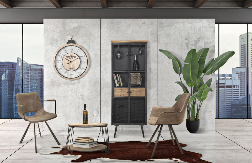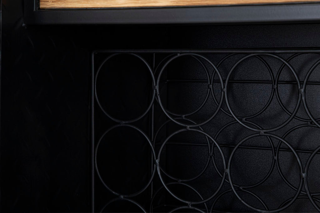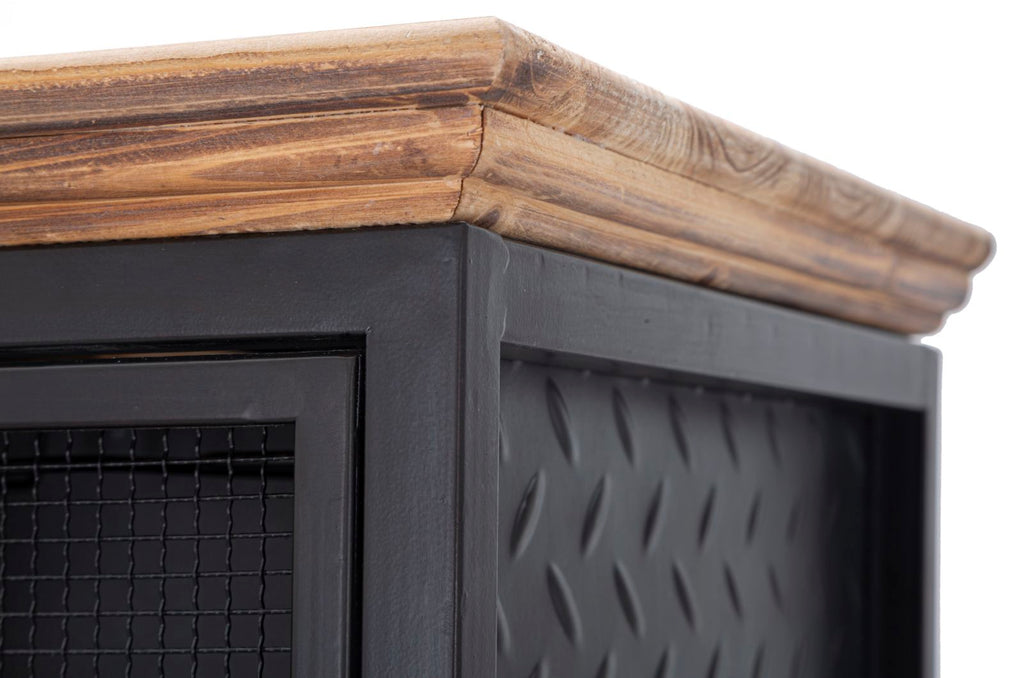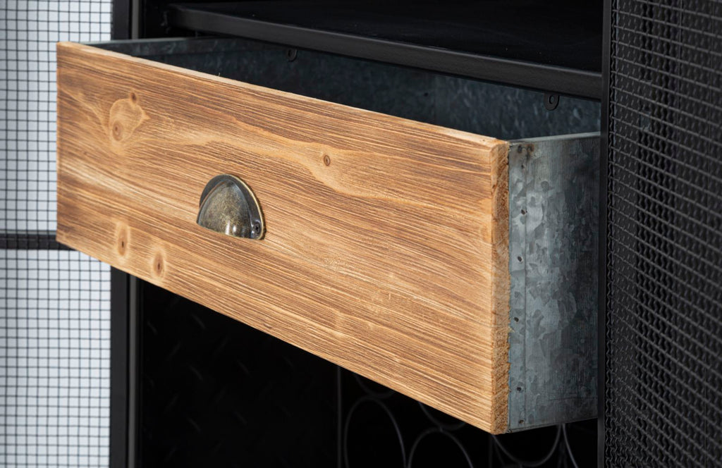 Mobile dallo stile industriale con due ante realizzate con rete. All'interno sono presenti un cassetto in legno al centro, 2 ripiani nella parte superiore ed un partico portabottiglie nella parte inferiore. Le linee decise ma squadrate e la particolare lavorazione donano un tocco di unicità ad ogni ambiente senza rinunciare alla sobrietà.