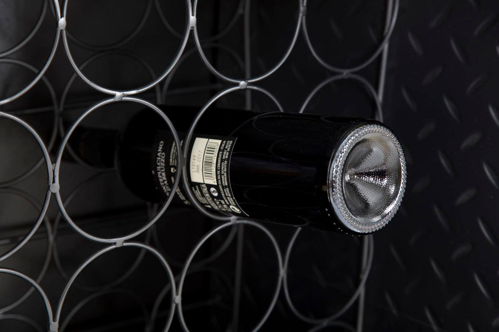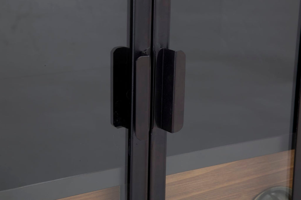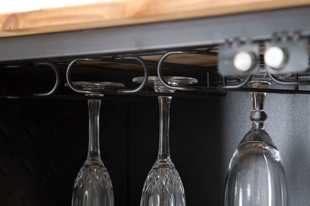 Mobile in metallo con 2 sportelli a vetro. All'interno sono presenti 2 cassetti con fronte in legno, portabicchieri e portabottiglie. Mobili che hanno un grande impatto visivo e che renderanno ogni ambiente originale ed underground senza rinunciare alla praticità.