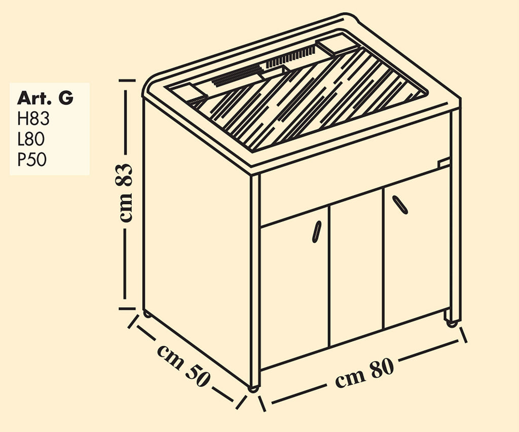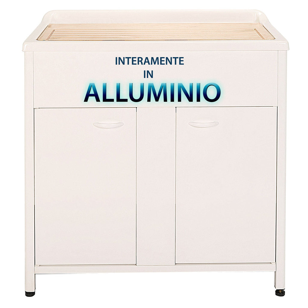 Lavatoio che unisce funzionalità e design. Completamente disegnato e prodotto in Italia, è la giusta unione di gusto e praticità. Costituito da un lavabo integrato munito di asse di lavaggio in legno marino che funge anche da copertura della vasca per mantenerla pulita o come ulteriore piano di appoggio. Alla base del lavabo, vi è un pratico mobiletto a due ante, utile per sistemare in modo ordinato detergenti, detersivi. La struttura è interamente in alluminio trattato per renderlo altamente idrorepellente e la vasca in metacrilato stampata a iniezione per maggiore resistenza, materiale dalla facile manutenzione. Il tutto di colore bianco adattabile, quindi, ad ogni stile d'arredo. Sifone incluso.
