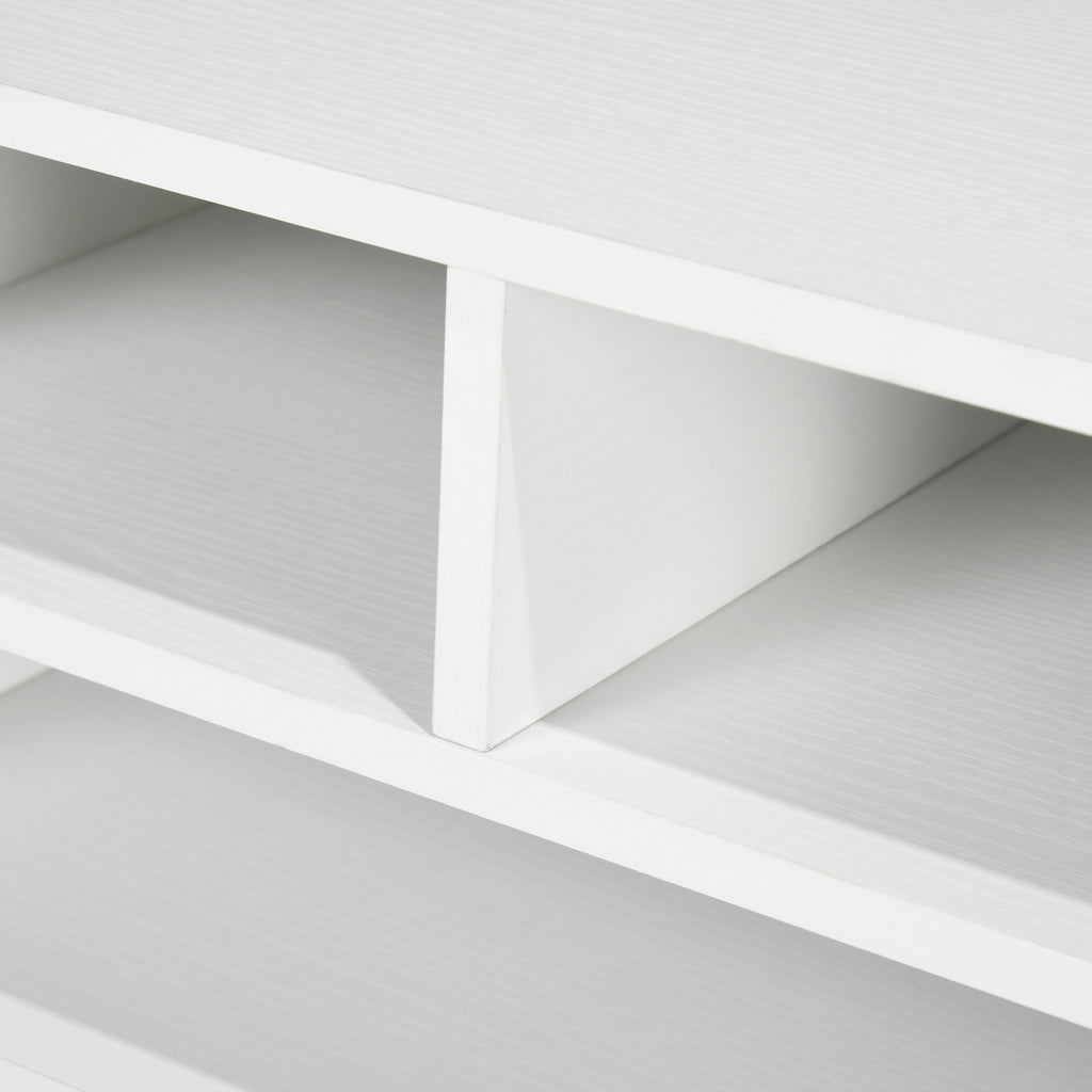 Questo mobiletto da ufficio con tre scomparti aperti è ideale per organizzare accessori e cancelleria, e sostiene una stampante sul piano superiore. Realizzato in truciolare robusto per resistere all'uso quotidiano, questo mobile da ufficio è protetto da un rivestimento in melamina che minimizza l'usura. Il mobile per stampante è l'alleato perfetto per ogni ufficio.
