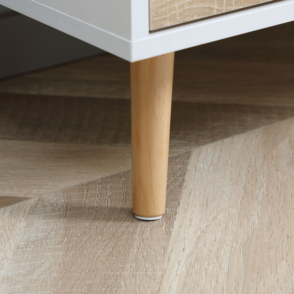 - COSTRUZIONE SOLIDA: Questo mobile tv basso è dotato di un pannello di truciolato e di cinque gambe in legno di pino, di cui la centrale è regolabile per garantirti una stabilità ottimale. Inoltre, le pedane protettive evitano i graffi