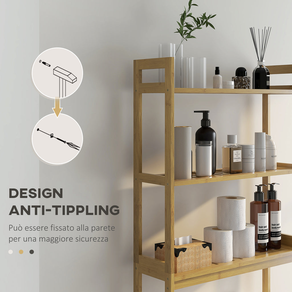 Sfrutta tutto lo spazio a disposizione del bagno e crea uno spazio aggiuntivo per i tuoi oggetti essenziali con questo mobile sopra wc di. Grazie ai 3 ripiani aperti a doghe con design verticale, il mobile da bagno salvaspazio si rende perfetto per i piccoli spazi. Realizzato in resistente bambù, il mobile possiede un aspetto naturale minimal ed è adatto all'uso quotidiano.