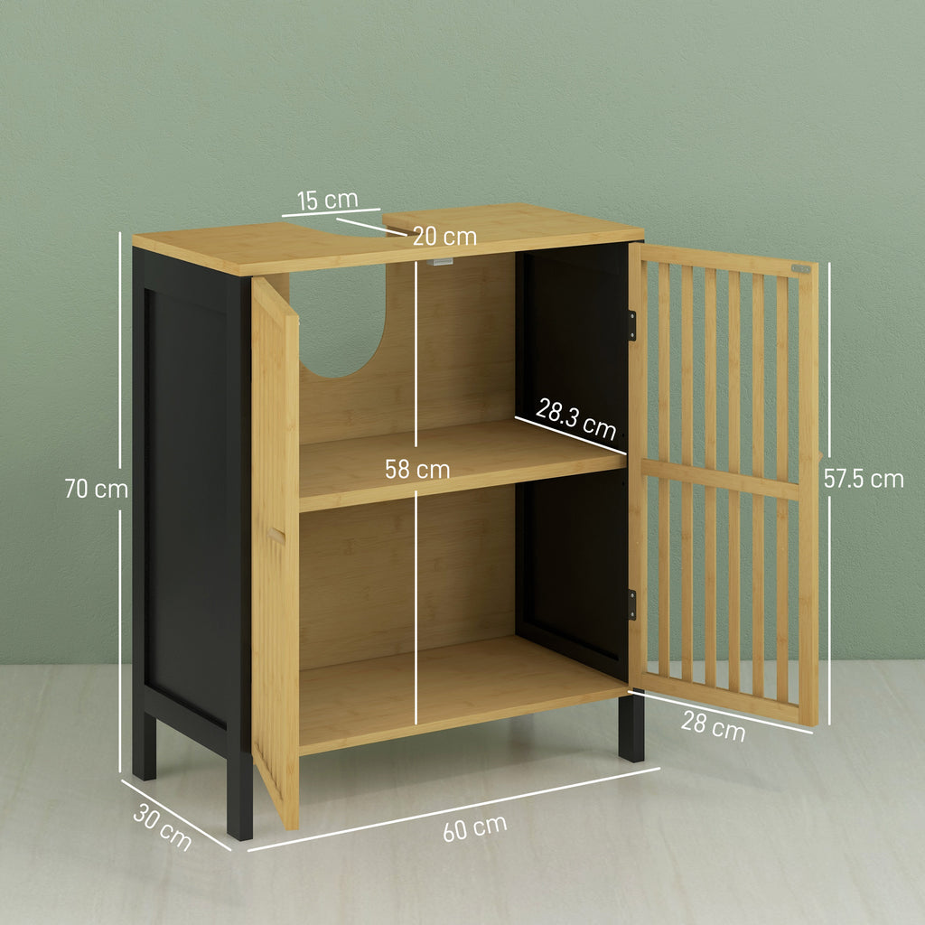 Mobile Sottolavabo Bagno con 2 Ante a Doghe 60x30x70 cm in Legno di Bambù e MDF con Intaglio a U Legno Naturale e Nero