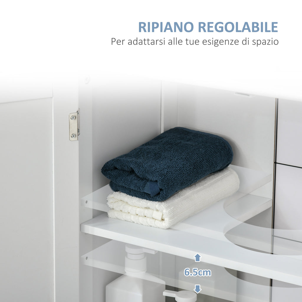 Opta per un design tradizionale con il mobiletto sottolavabo. Tonalità neutre, intagli delicati e maniglie eleganti definiscono il suo stile. Realizzato in MDF robusto con finitura verniciata per proteggere dall'umidità e resistere all'uso quotidiano. Lo scaffale regolabile permette di sistemare e dividere i prodotti da toeletta e l'intaglio a 'U' facilita l'inserimento intorno al tubo del lavandino, massimizzando lo spazio disponibile in modo sorprendente.