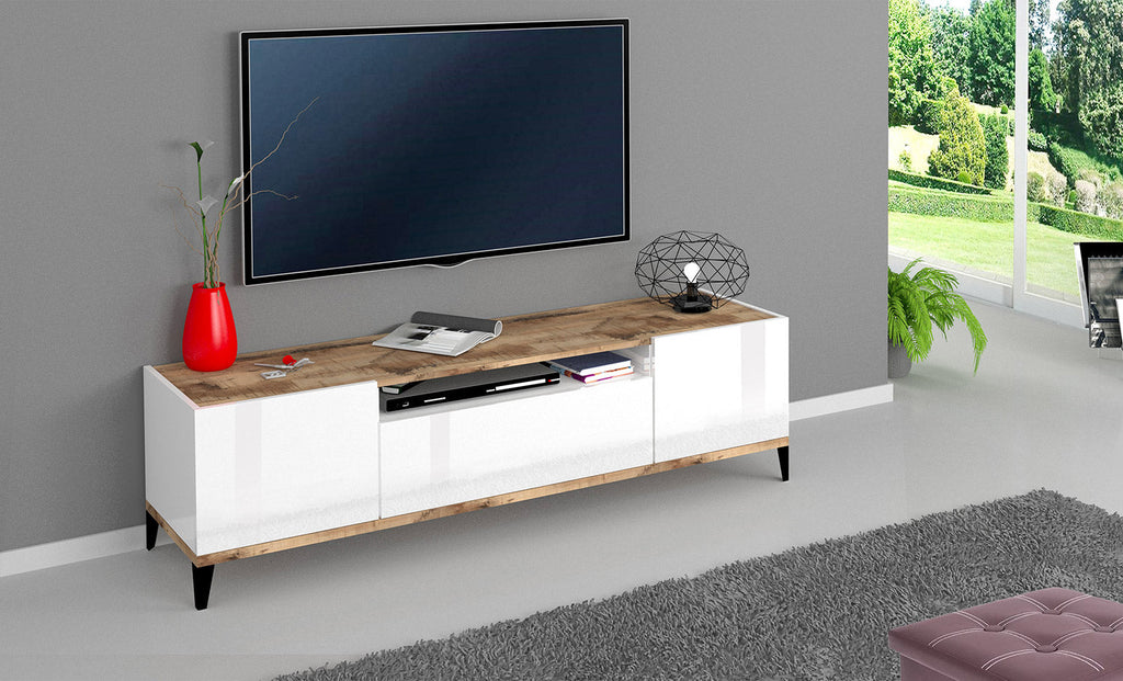 Il porta tv SUNRISE da 160 cm presenta 3 sezioni contenitive distinte, capienti e comode per una pluralità di oggetti di dimensioni diverse. Ai lati si trovano 2 spazio si vani con anta a battente, mentre la sezione centrale è costituita da un vano giorno e da un profondo e ampio cassetto scorrevole. Top e base del mobile sono di finitura coordinata e la struttura è sorretta da 4 piedini in plastica di forma pirami dale.