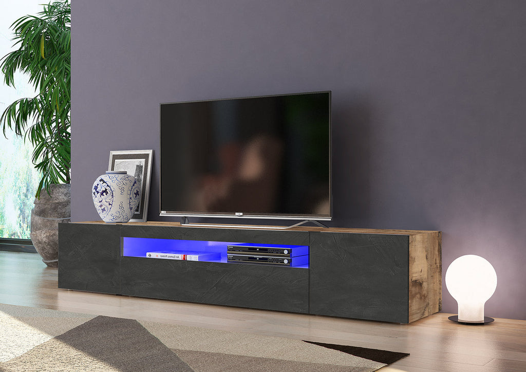 Il porta tv DAIQUIRI da 200 cm è costituito da un unico modulo basso in solido legno su cui è possibile poggiare tv anche di grandi dimensioni. La struttura è divisa in 3 sezioni contenitive: la parte centrale presenta sia un vano giorno per porre decoder e altre apparecchiature, sia un vano con anta a ribaltaper altri accessori. Il vano a giorno è dotabile di luci bianchi e blucon telecomando per gestione da remoto. Ai lati, 2 ante a battente celano un capiente vano ciascunoper archiviare oggetti più voluminosi. La diversa configurazione delle sezioni contenitive permette di mettere ordine e organizzare l’area in base alle proprie esigenze