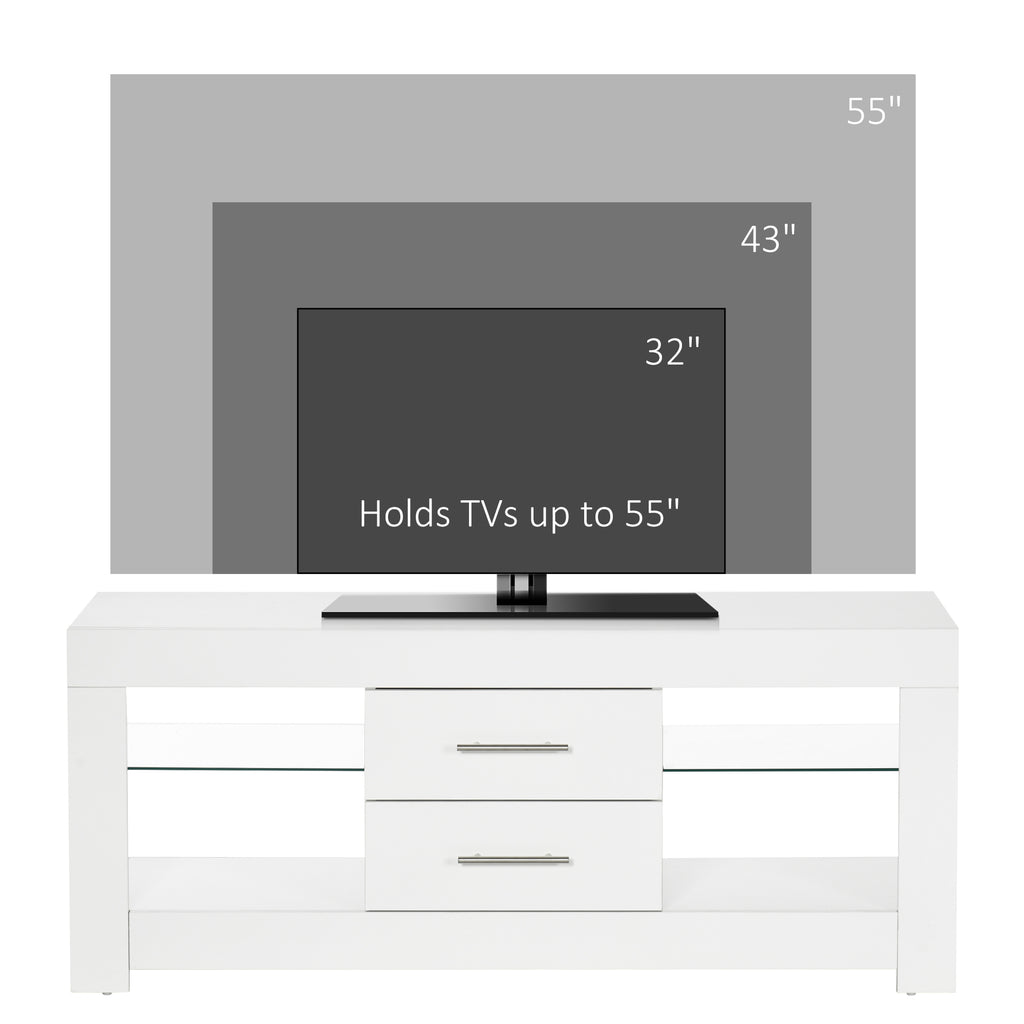 Se sei in cerca di un mobile TV che porti stile e originalità nella tua casa, questo mobiletto è quello che fa per te! Ha un'ampia superficie che consente di appoggiare TV fino a 55", ed è dotato di ripiani aperti e 2 cassetti per tenere tutto in ordine. Con le luci LED integrate nei ripiani in vetro puoi scegliere tra 12 colori e 4 modalità di illuminazione. Sorprendi tutti con questo arredo moderno!