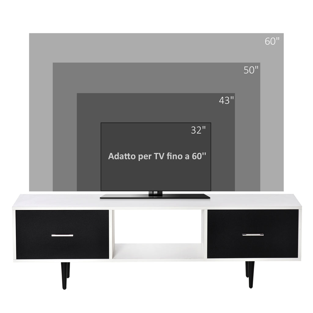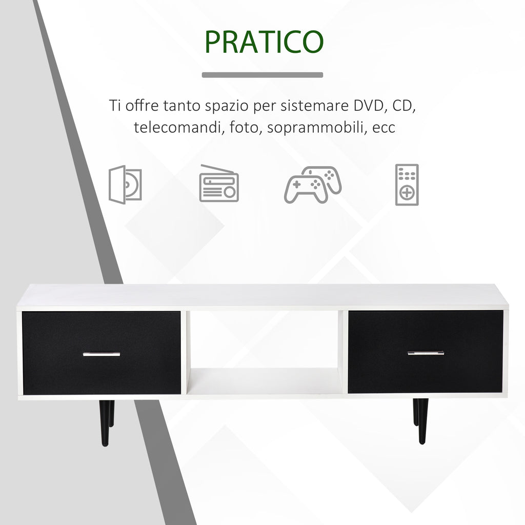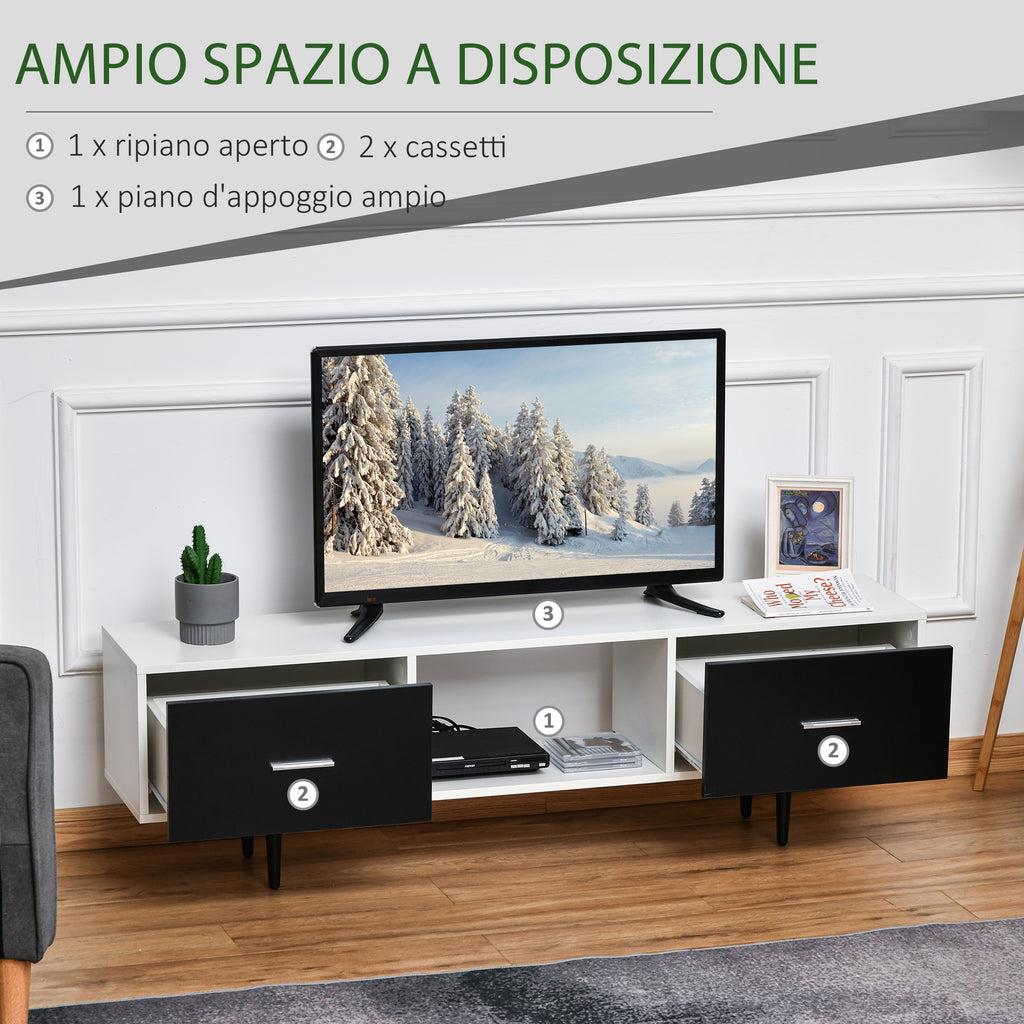 Cambia il tuo modo di guardare la TV con questo mobile TV moderno. Costruito in legno MDF bianco e nero, ha un ampio scompartimento e due cassetti che puoi usare per sistemare dispositivi elettronici, casse e molto altro. Grazie al foro passacavi, infatti, organizzi al meglio lo spazio ed eviti disordine o accumuli di polvere. Cosa aspetti, prepara popcorn, patatine e bibite e rilassati davanti a un buon film con !