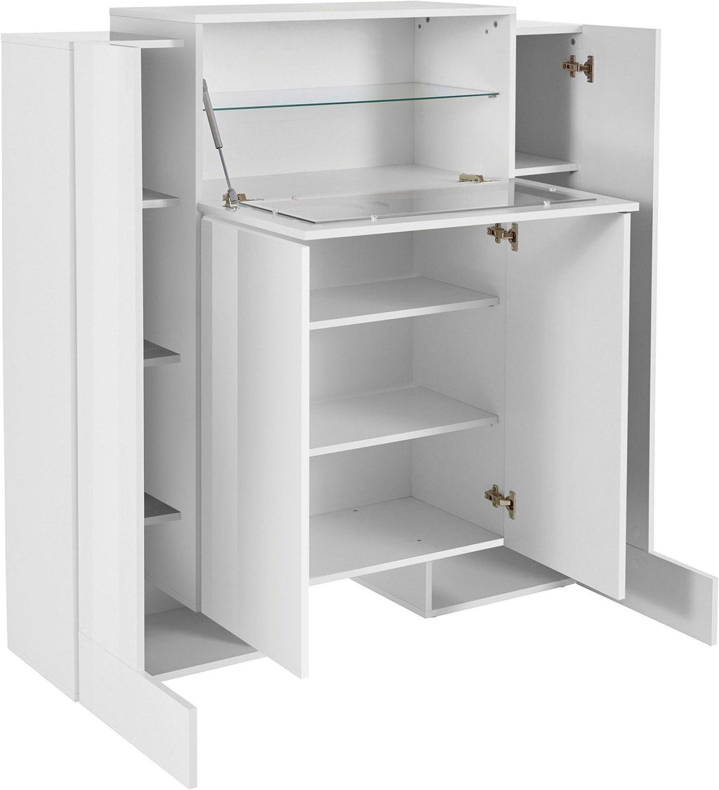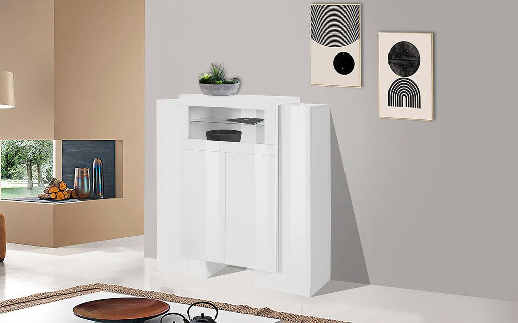 La struttura del complemento d’arredo è caratterizzata da 2 ante battenti a L. Al suo interno sono presenti sei ripiani in legno, che garantiscono un ampio spazio e sono utili per riporre documentazione e oggetti di vario tipo. La struttura centrale della vetrina ha due ante battenti. All’interno sono presenti due ripiani in legno e un'anta telaiocon all’interno un ripiano di vetro. Sia le ante laterali che la strutturasono in melaminico bianco laccato lucido, mentre la parte centrale varia nei 3 colori: bianco, report e acero pereira. La vetrina PILLON 2+2 ante e 1 anta telaioviene consegnata con un pratico kit di montaggio e istruzioni, per poterla installare in modo semplice.