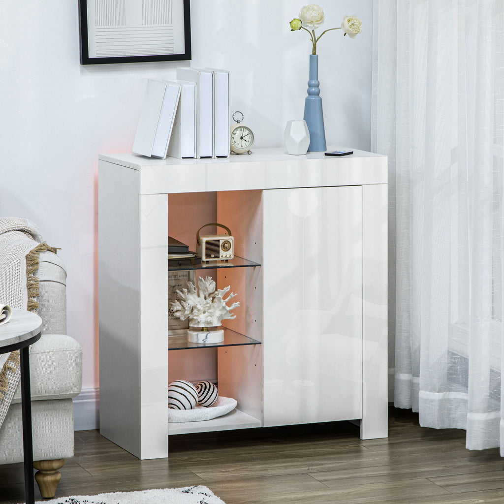 Elimina per sempre il disordine e abbraccia questo elegante mobiletto da salotto dal look elegante e di tendenza. Sono presenti tre ripiani aperti e un armadietto per offrirti un ampio spazio a disposizione. Le luci LED blu sui ripiani in vetro aggiungono ulteriori elementi di spicco alla struttura del mobile. Scopri subito il nostro mobiletto multiuso e dì addio a tutto il disordine che c'è in giro per le stanze.