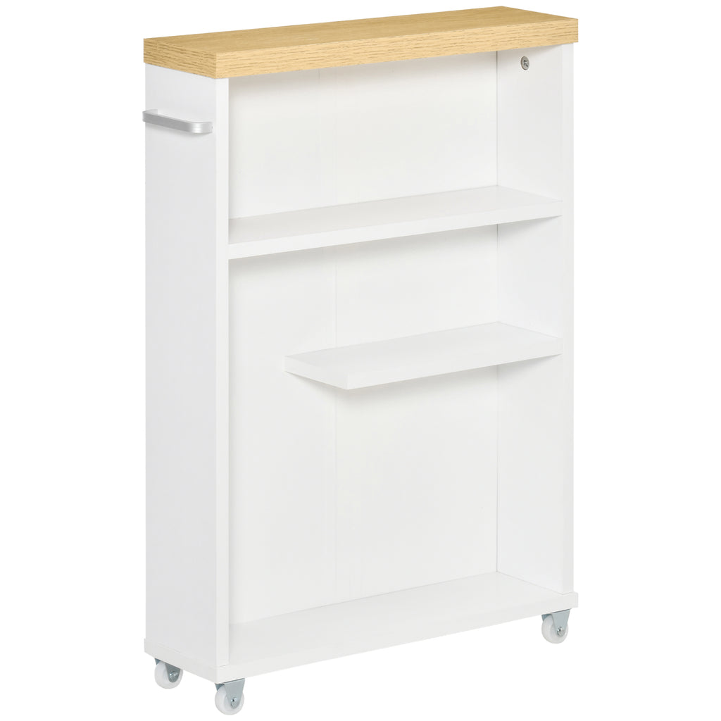Questo mobile da bagno con stile moderno è ideale per il bagno. Larghezza stretta, perfetto per spazio piccolo. Ci sono tre scafffali, offre spazio sufficiente per riporre la carta igienica e gli asciugamani. Con ruote e maniglie laterali, può essere spostato liberamente e facilmente senza rumore. La costruzione in legno, la finitura bianca e la maniglia argentata rendono questo contenitore robusto e attraente.