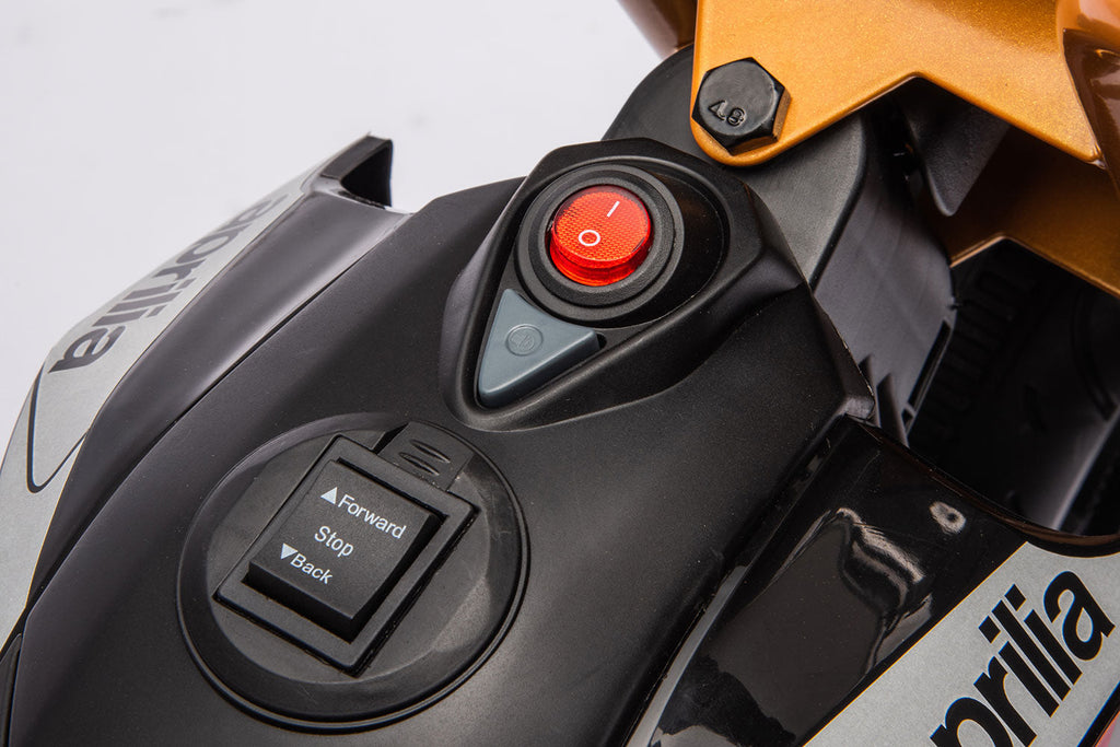 La moto elettrica Aprilia Dorsoduro offre la funzione di marcia avanti e retromarcia. Licenziato Aprilia, è dotato di luci a LED e suoni predefiniti per una maggiore esperienza di guida realistica. L'accelerazione avviene premendo il pedale, mentre le due ruote sono affiancate da due stabilizzatori posteriori per garantire una maggiore stabilità durante il viaggio. Le dimensioni compatte di 82,5x44x56 cm rendono questo veicolo adatto ai bambini di varie età.