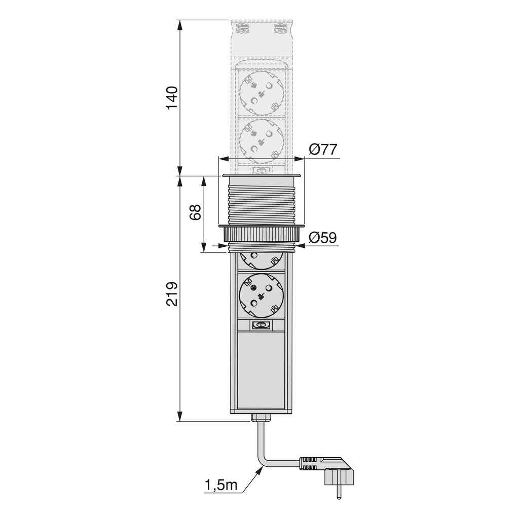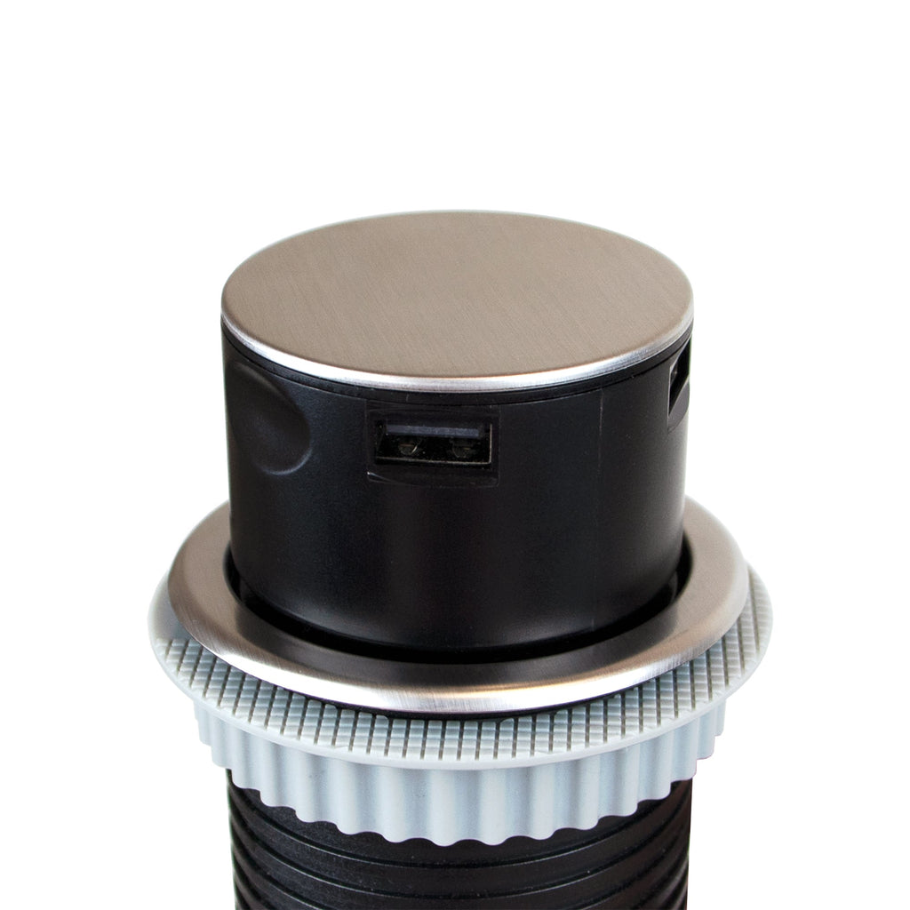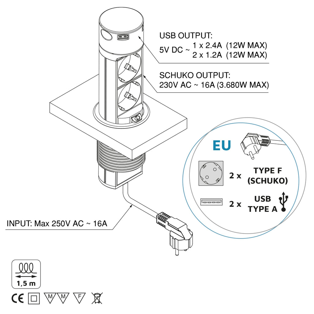 Questo connettore dispone di due prese elettriche tipo F schuko (EU) con una potenza massima ammissibile fino a 3680W - 16A e due connettori USB per la ricarica veloce di dispositivi elettronici 5V DC (1 x 2,4A / 2 x 1,2A) con una potenza massima di 12W. Per utilizzare i connettori USB è sufficiente una leggera pressione sulla superficie in acciaio inossidabile, che li rende entrambi accessibili. Se poi devi utilizzare le prese di corrente, puoi tirare il blocco verso l'alto per renderle accessibili.