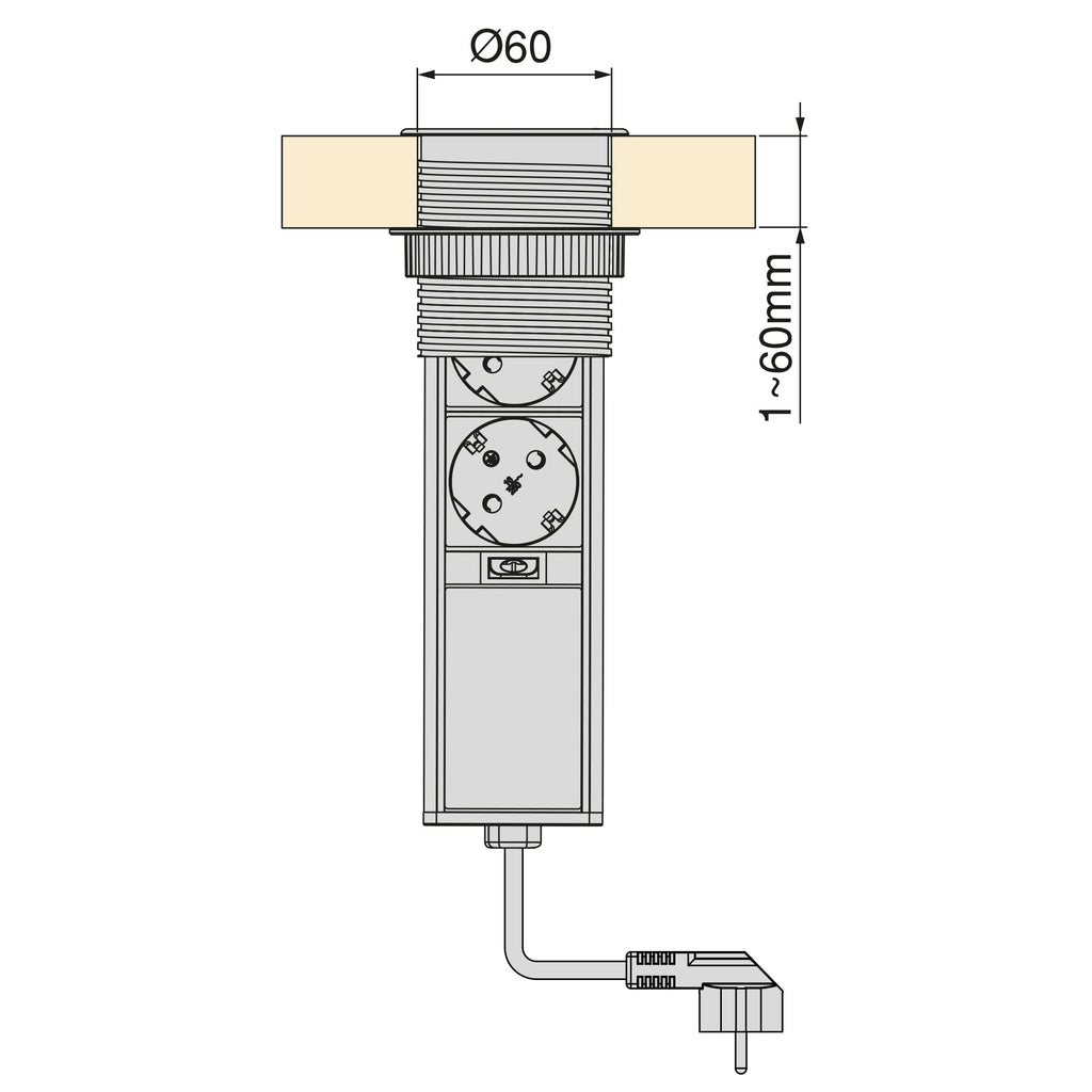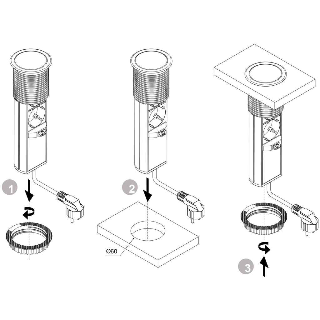 La sua installazione è molto versatile in quanto richiede solo un foro di diametro 60mm (si adatta perfettamente alle scrivanie già dotate di passacavi da 60mm) e può essere montato su superfici di grande spessore, tra 1 e 60 mm. Inoltre si fissa ai mobili senza bisogno di attrezzi grazie a una bussola di bloccaggio manuale.