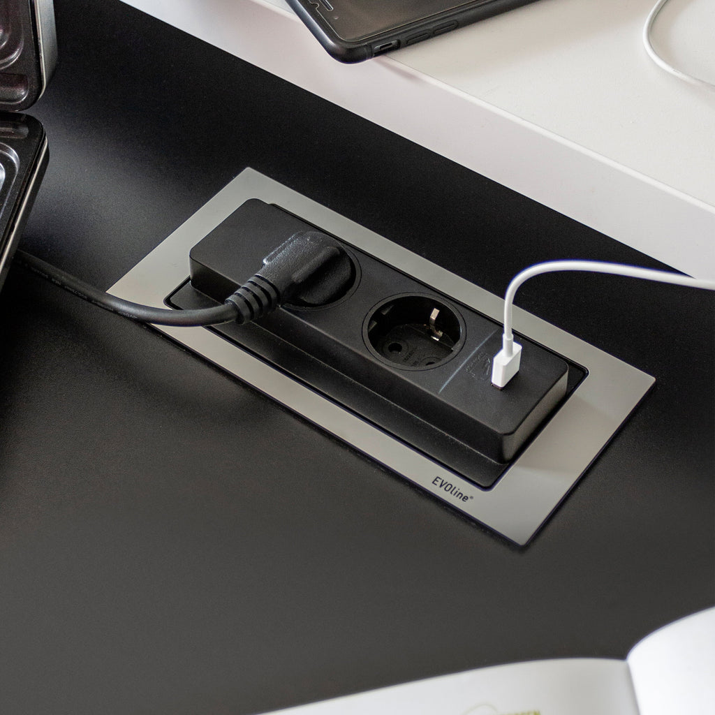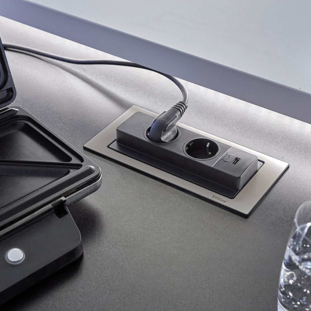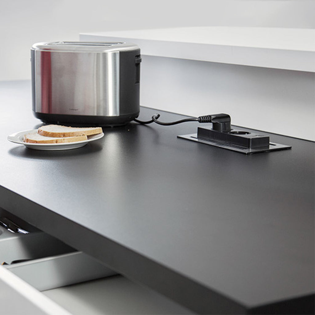 Base multipresa con un'elegante finitura in acciaio inox che permette una completa integrazione a incasso nei mobili di cucina, ufficio e casa. Il suo design innovativo mantiene le prese nascoste quando non sono in uso e con un leggero tocco è girevole per accedere alle prese.