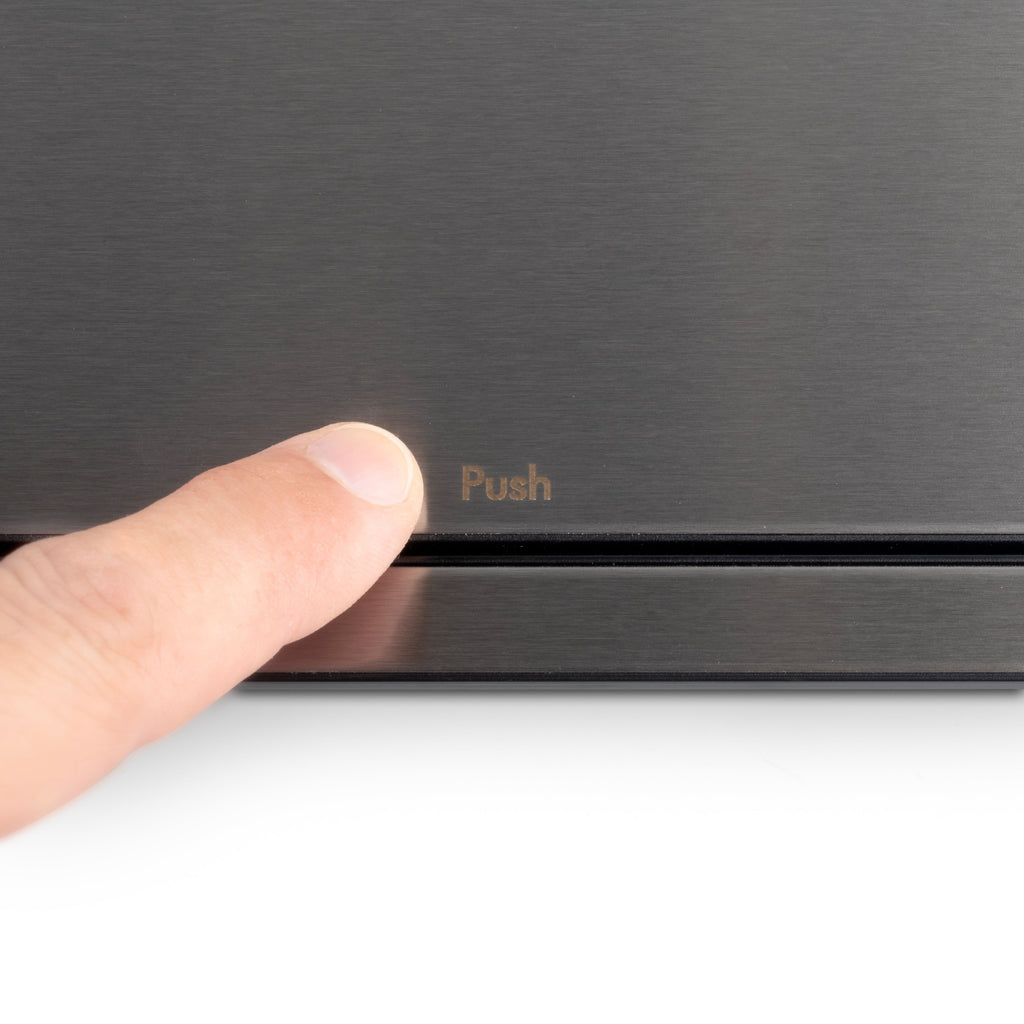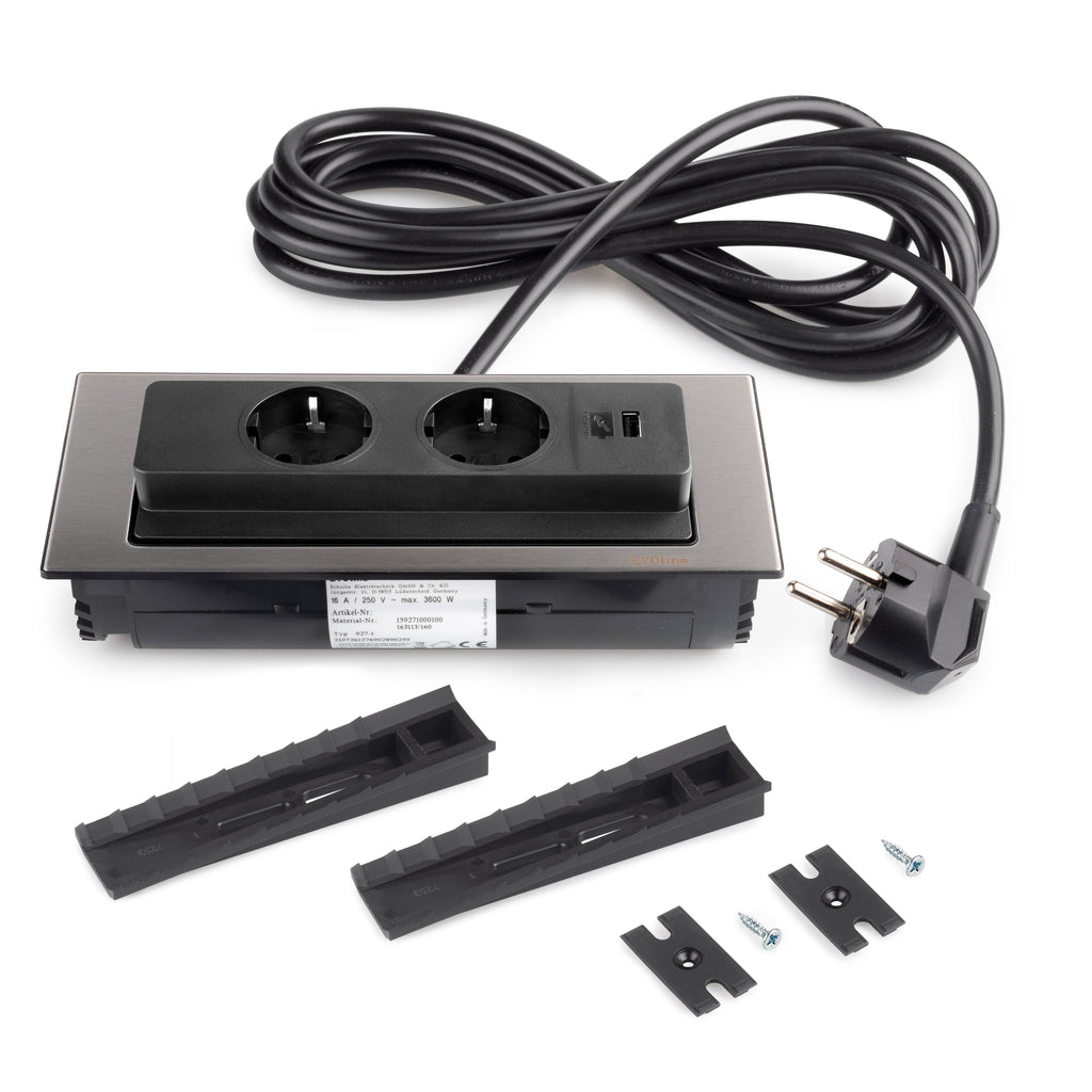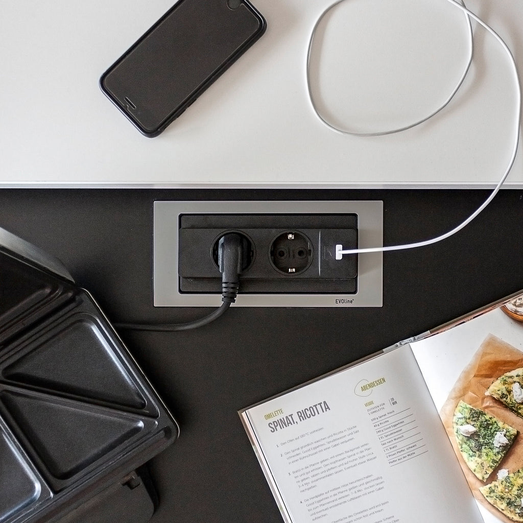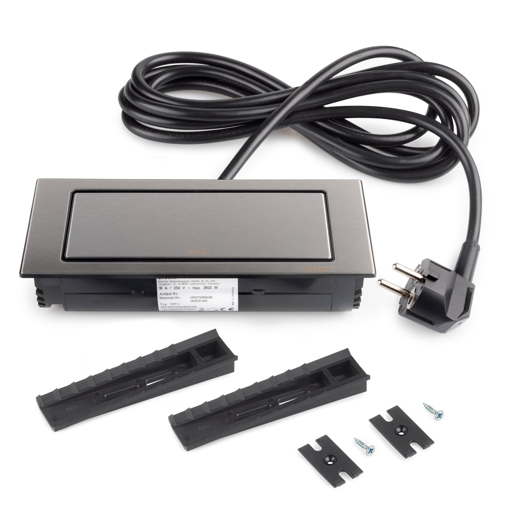 Base multipresa con un'elegante finitura in acciaio inox che permette una completa integrazione a incasso nei mobili di cucina, ufficio e casa. Il suo design innovativo mantiene le prese nascoste quando non sono in uso e con un leggero tocco è girevole per accedere alle prese.