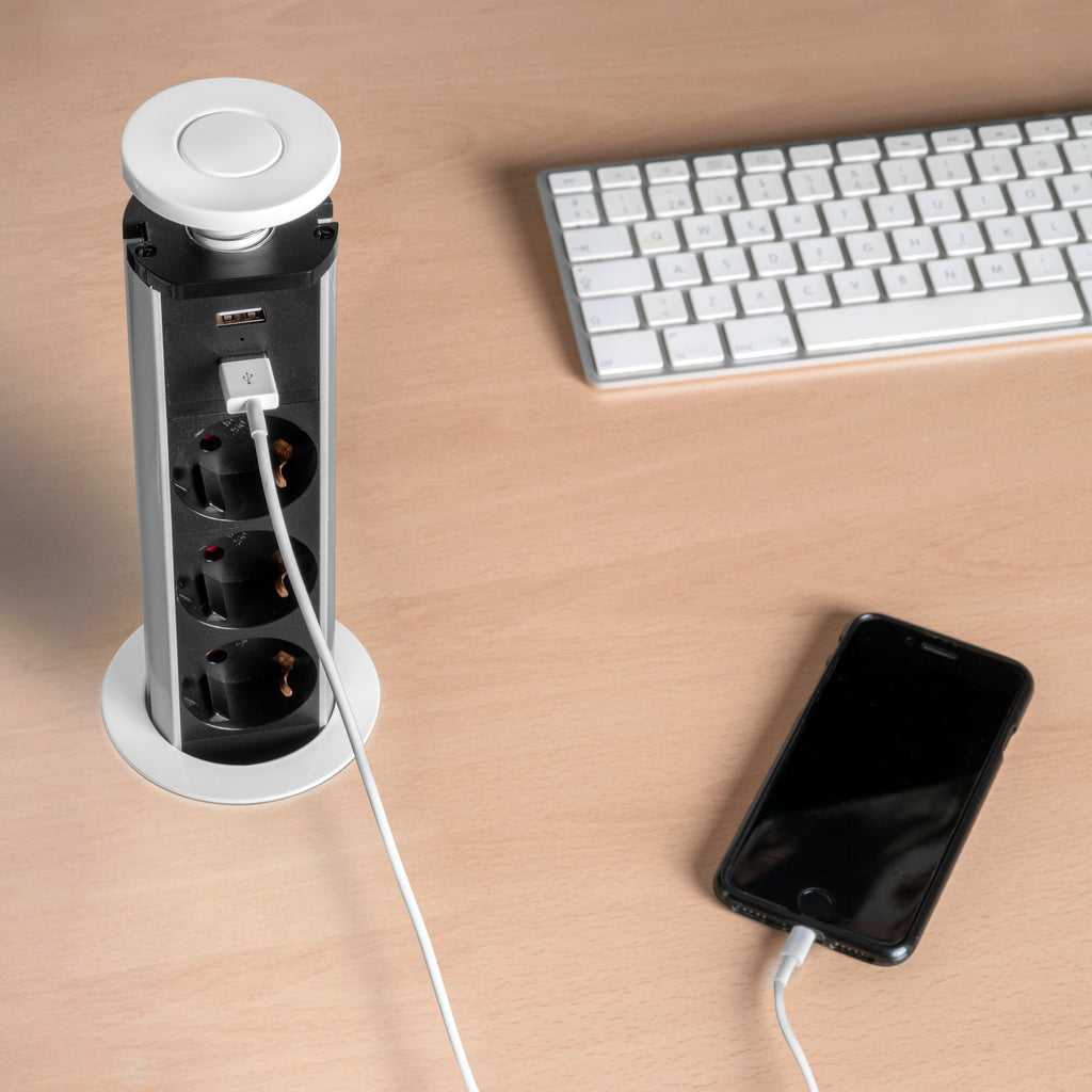 Connettore multipresa o torretta di prese estraibile, progettato per apportare funzionalità con la sua completa integrazione nell'arredo per la casa e dell'ufficio. E' pensato per essere incassato tanto nei moduli alti come in quelli bassi grazie al suo design di facile estrazione e occultazione manuale. Si adatta perfettamenteo alle scrivanie già provviste di passacavi.
